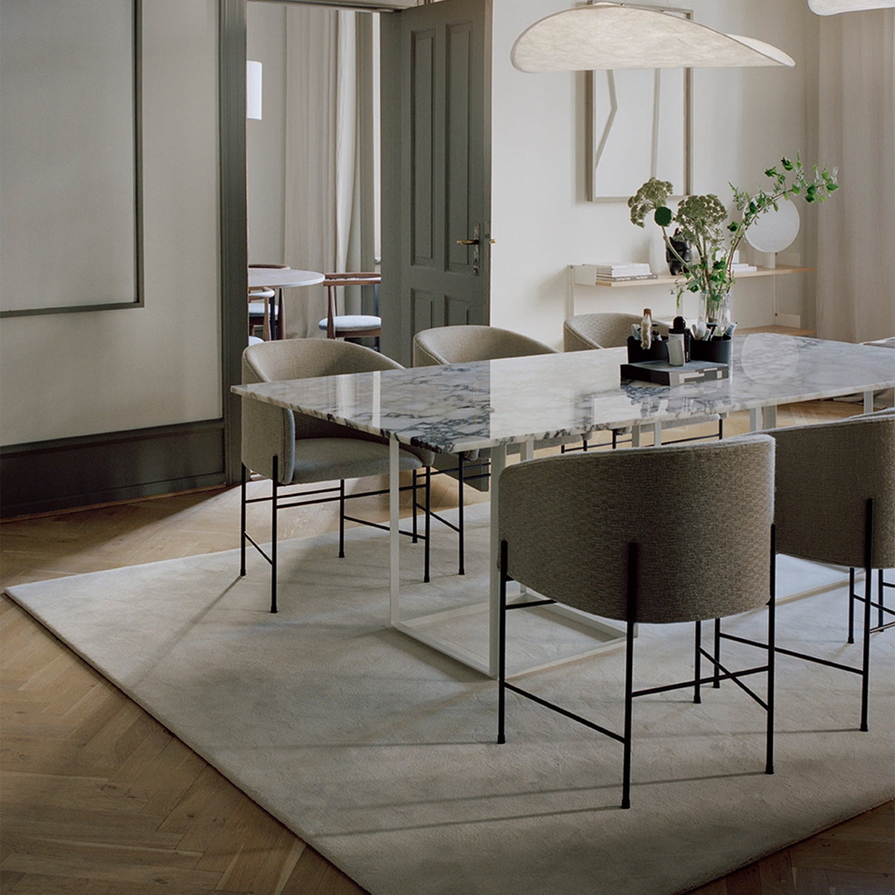 When lingering awhile at the table, the Covent Dining Chair from Danish design house New Works redefines comfort. Copenhagen designer Rene Hougaard posits an embracing rounded armchair on a thinly wrought metal framework with Mondrian-like geometry. This seemingly floating cocoon, upholstered in fine textiles or soft leather, melds traditional craftsmanship with a memorably modernist spirit.