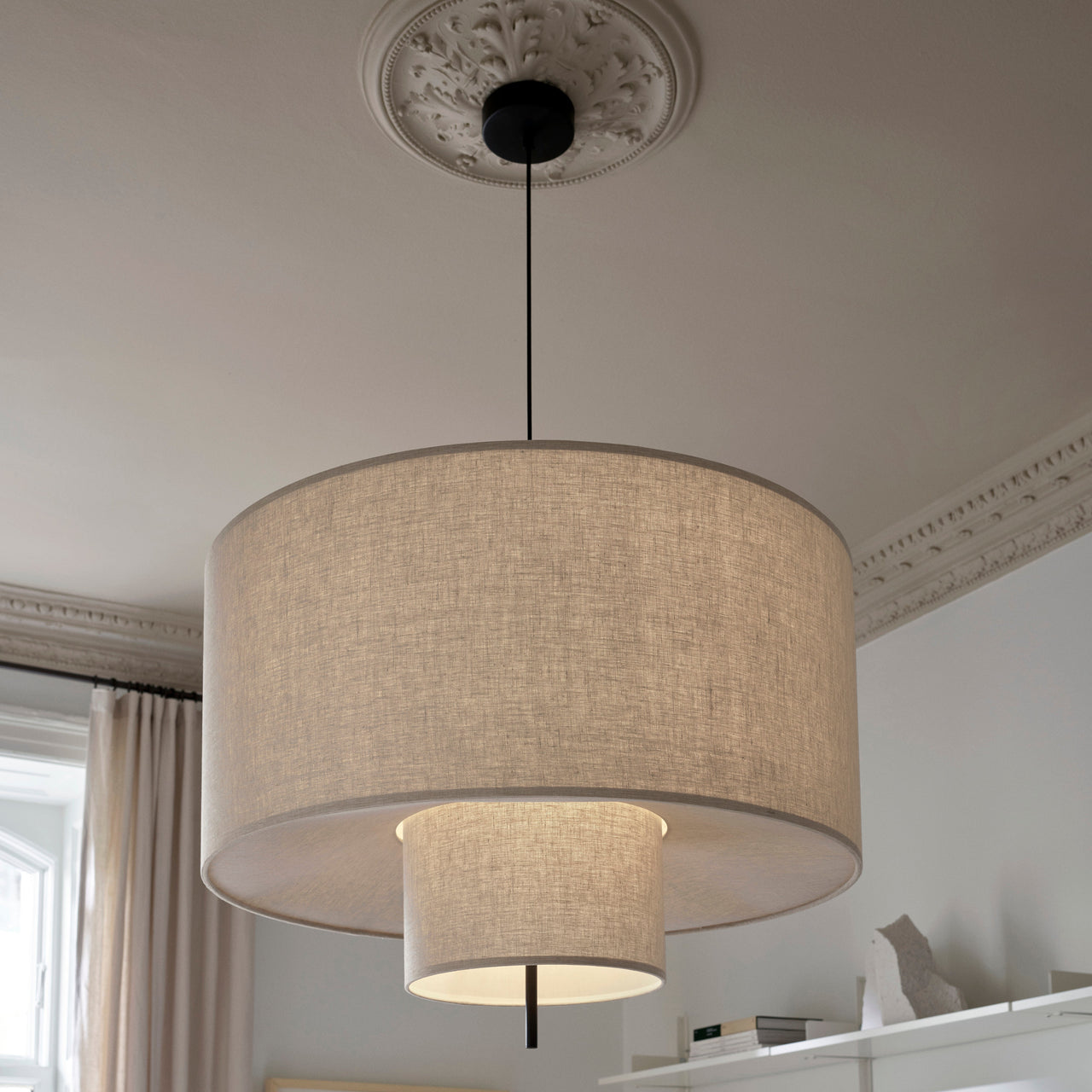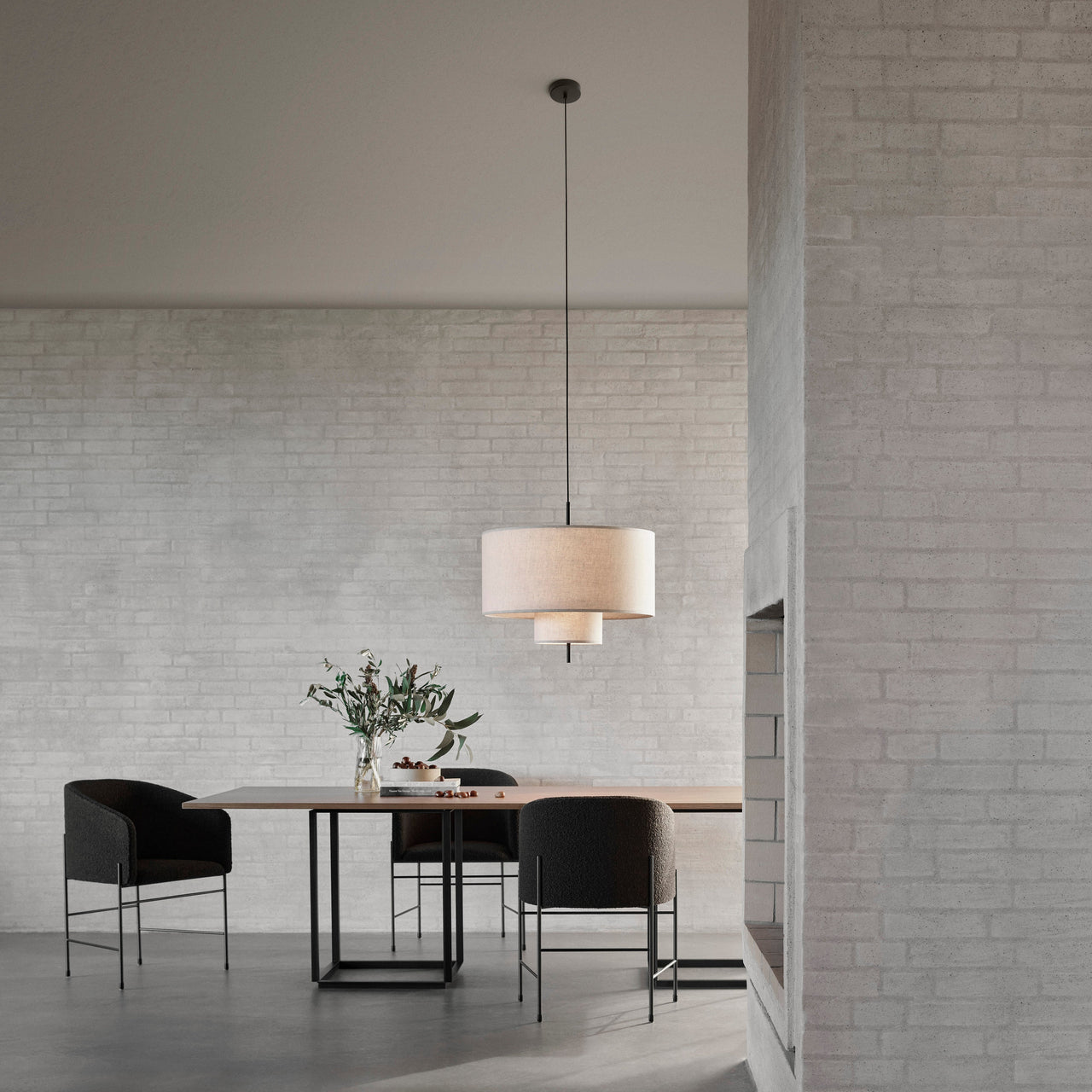Striking at each of its 3 sizes, the largest pendant model of Margin makes the ultimate statement in larger spaces. Stockholm designer John Astbury’s lighting series with its tiered textile shade spreads glare-free illumination from either 2 or 3 LED bulbs. Suspended by a slender black powder-coated metal rod, the natural doubled-shade creation brings a tactile intrigue and warm ambiance to any setting.
