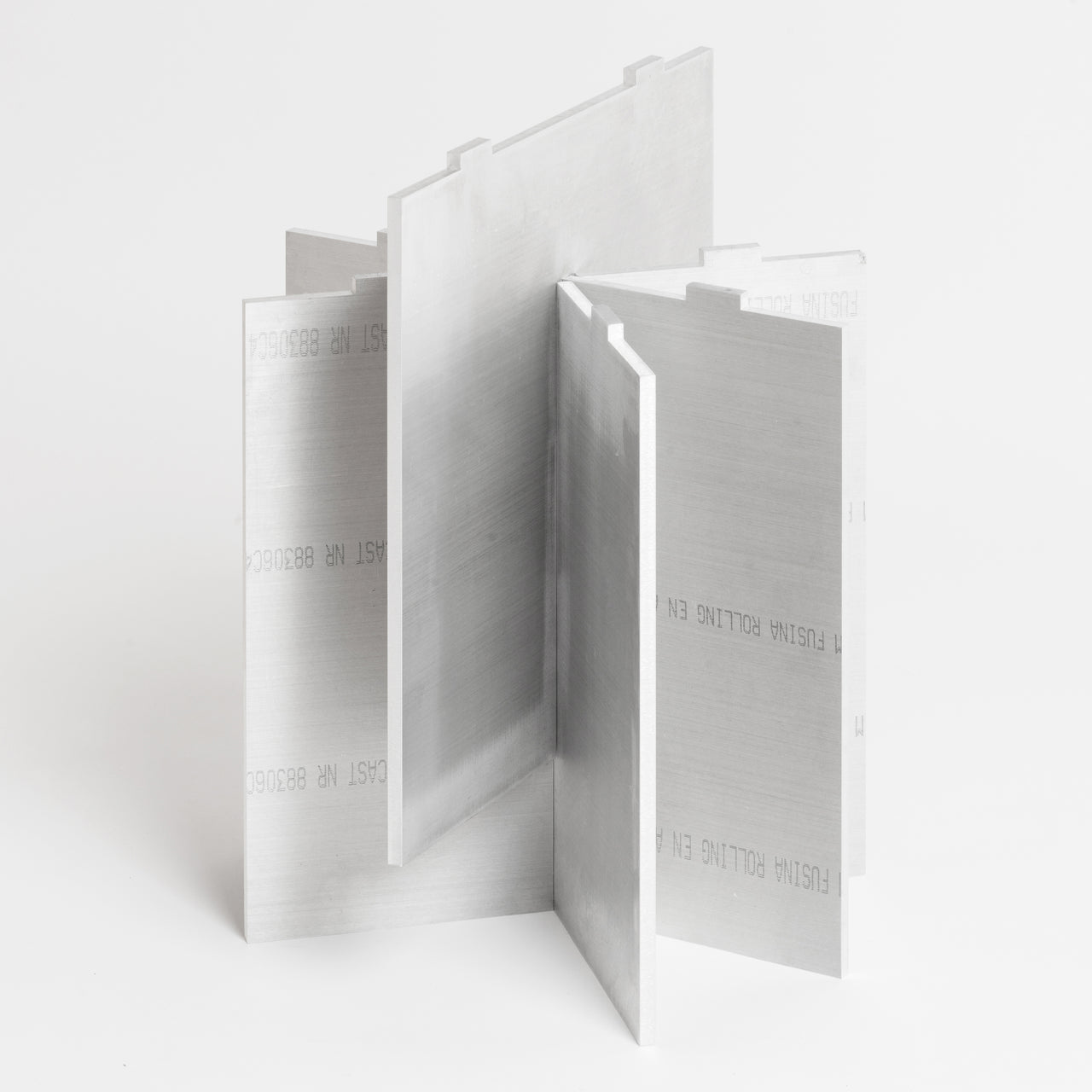 This side table is shaped from eight angled panels joined to form an octagonal base, supporting a solid top with matching geometry. Made from 10 mm aluminium and assembled without fasteners, it offers a sturdy presence. The untreated or satin-coated finish reveals the raw surface of the metal, which naturally develops character over time through exposure and use.