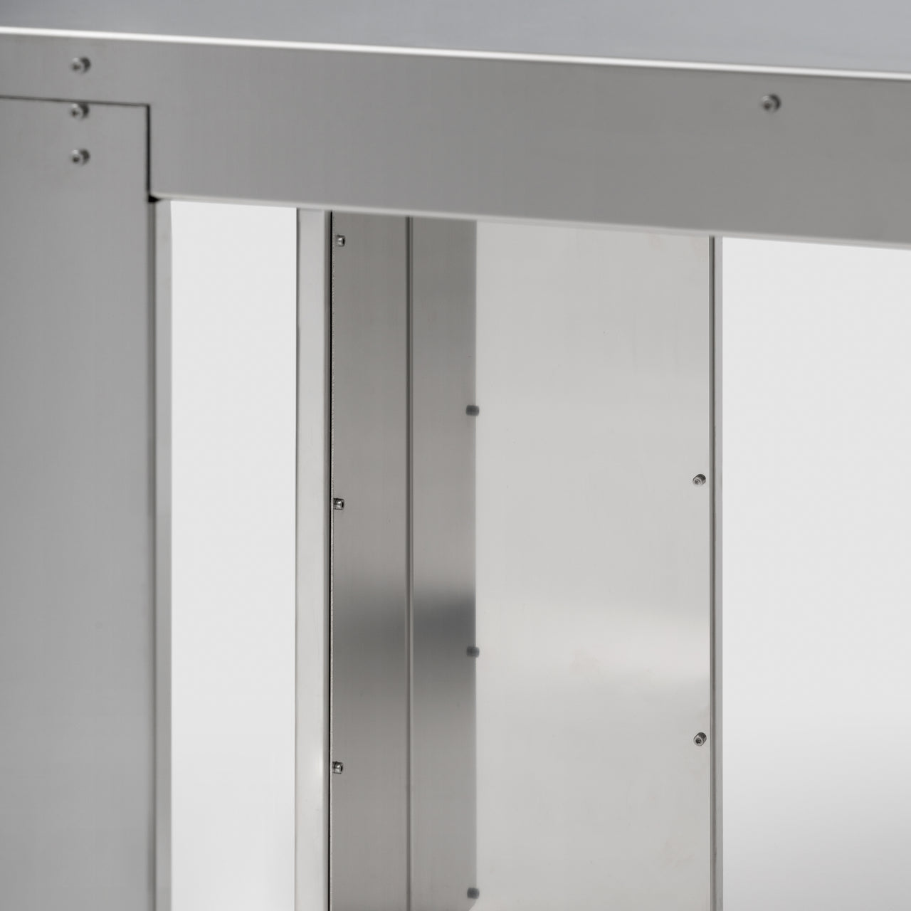 This dining table is built from 1.5 mm BA inox steel using 2D CNC cutting and dry assembly, resulting in a clear rectangular form with strong, defined edges.It remains firmly grounded while maintaining an open profile. Untreated versions develop a patina over time, highlighting the raw quality of the material.