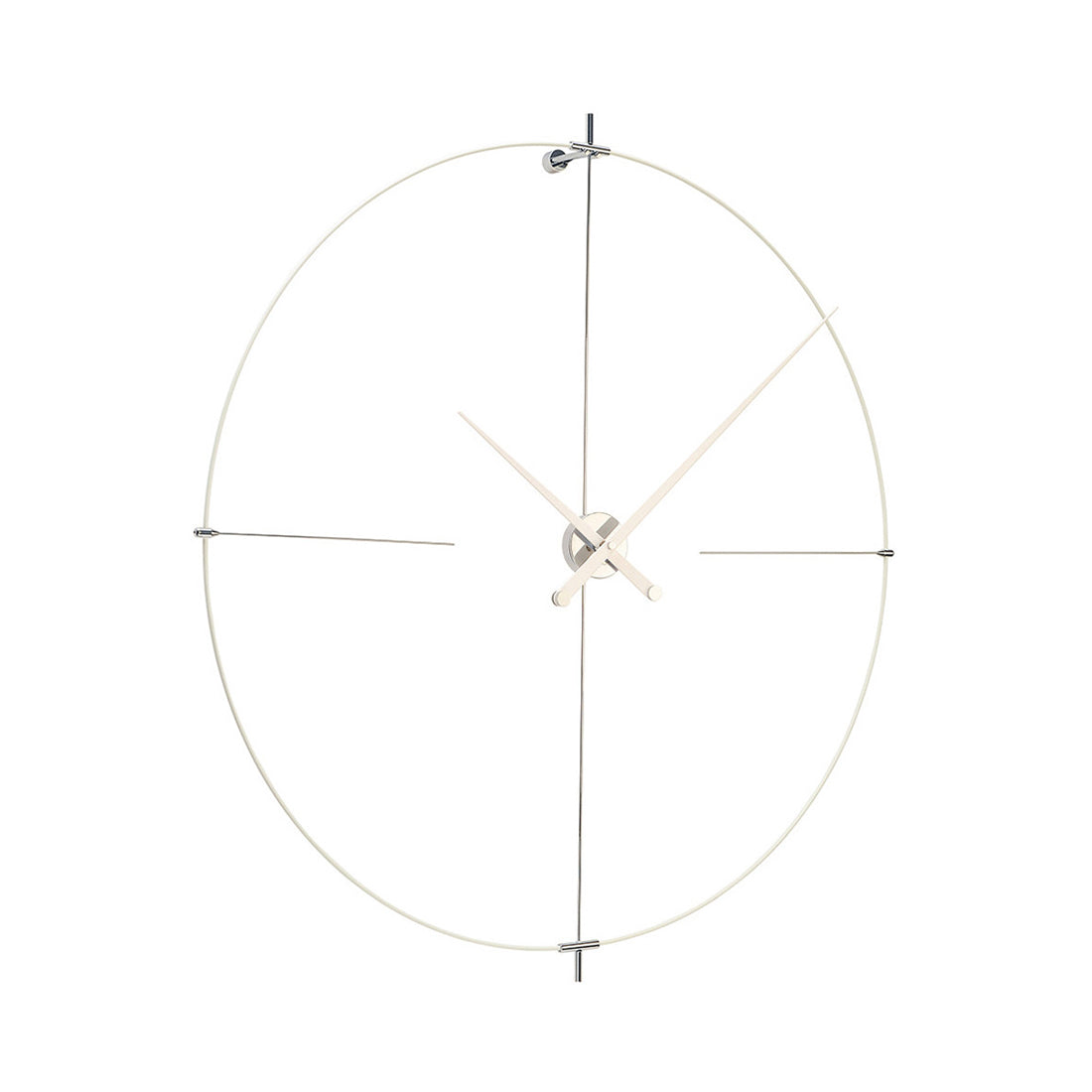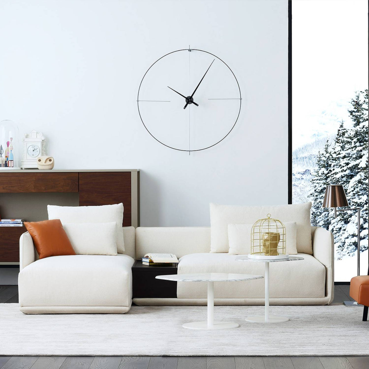 Bilbao's suspended ring enhances a minimalist vibe via Nomon’s crisp styling in a choice of black or white with needle hands to match or contrast — or choose an accent of gorgeous genuine walnut. Available in regular and mini versions, the handcrafted wall clock's metal support and center box come in complementary chrome or brass finishes. Battery-powered and made in Spain with a precision German quartz works, the statement clock is easily installed to elevate any space.
