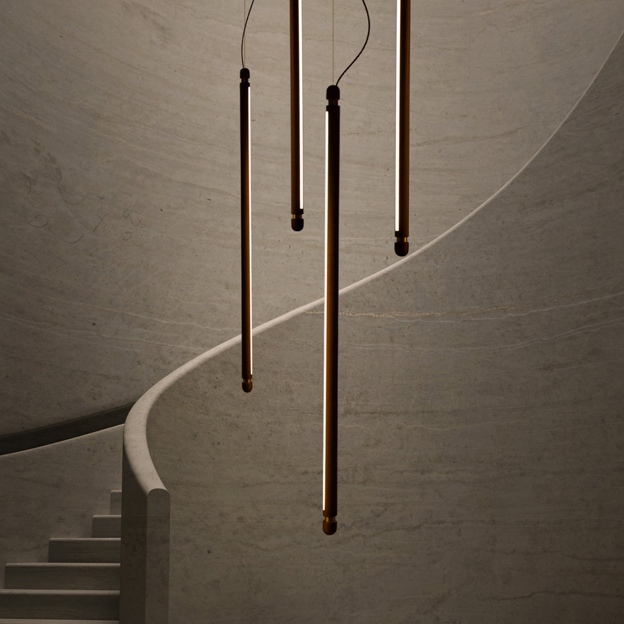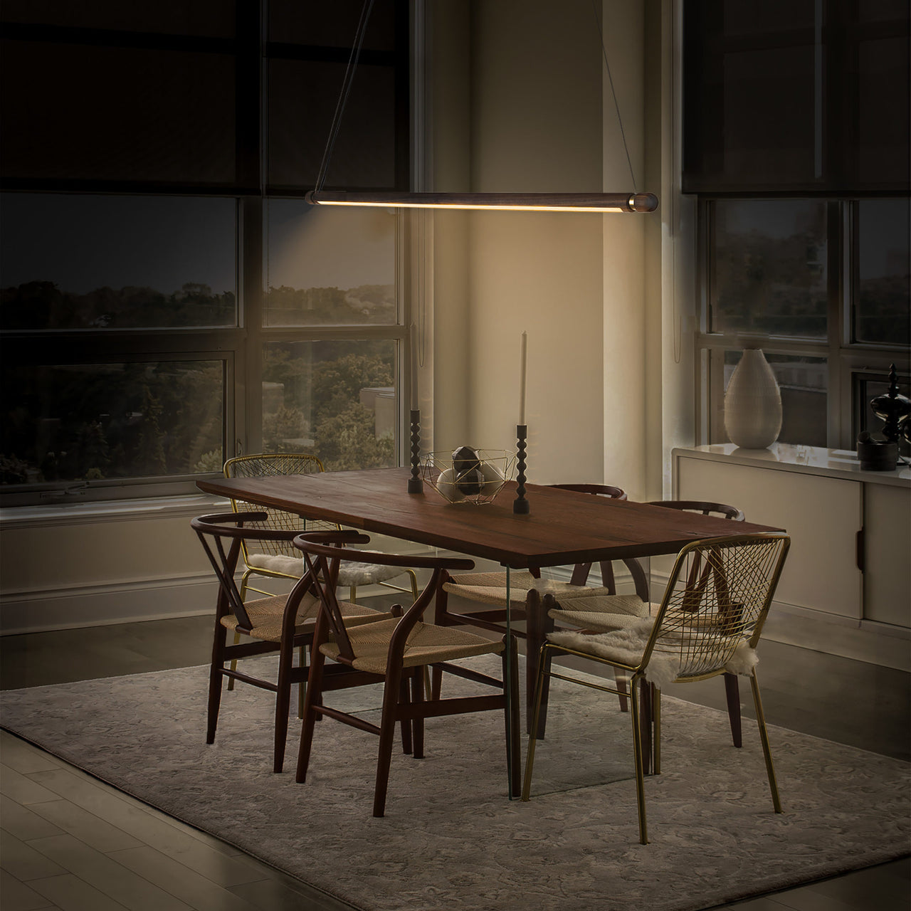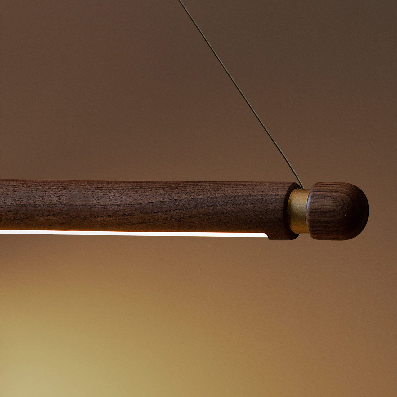 The Linea Suspension Lamp is designed with a natural walnut or oak wood body. Metallic accents complement the wood, adding subtle contrast. Suspended by steel cables, the lamp appears to float, bringing a sense of lightness to the space. It is available in multiple configurations, including horizontal and vertical orientations.
