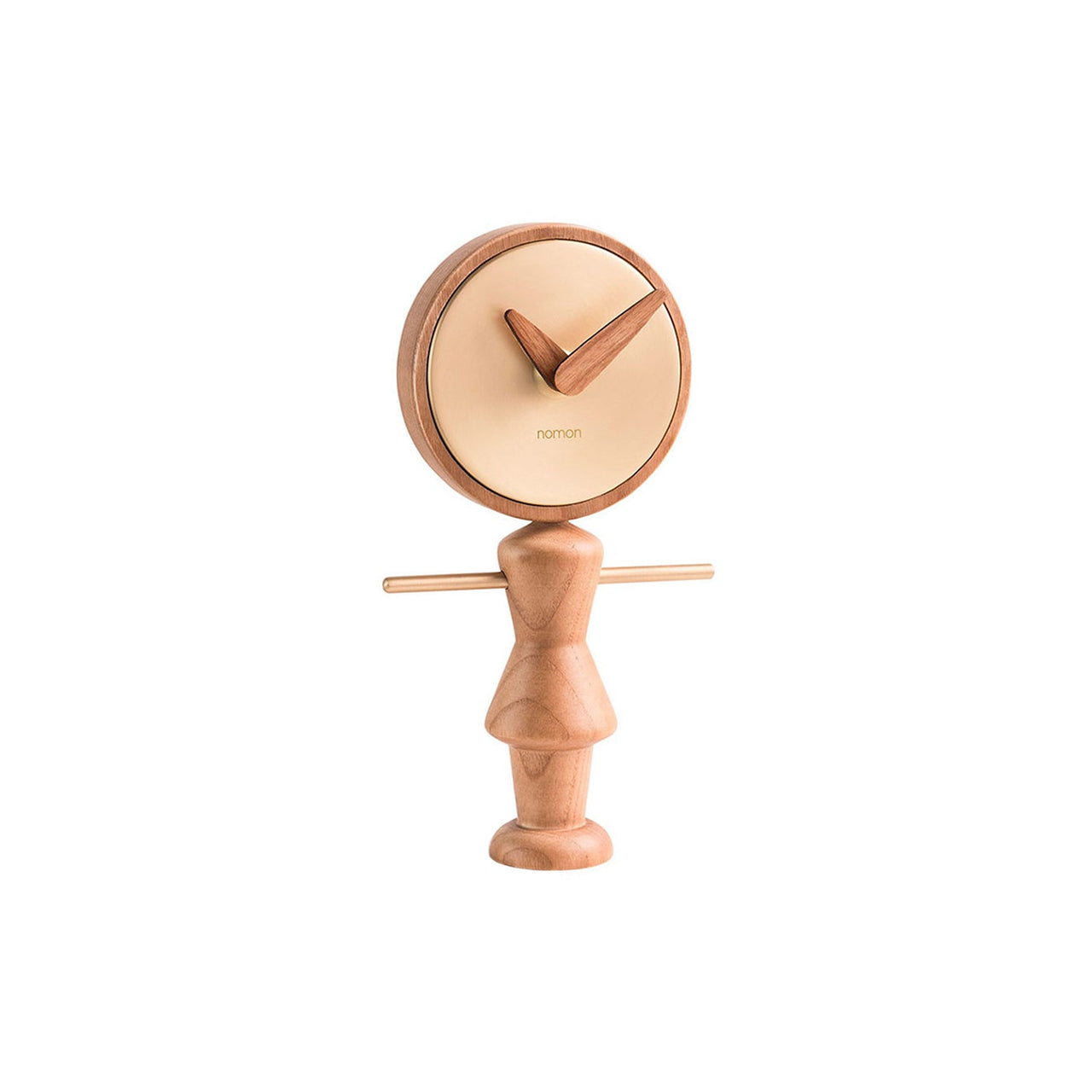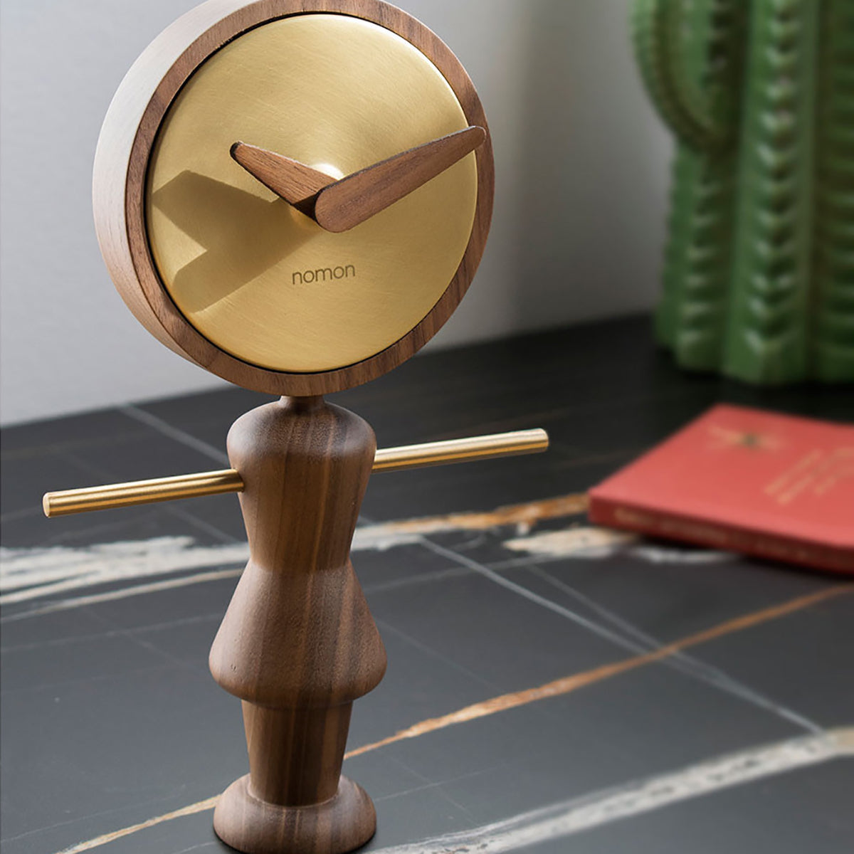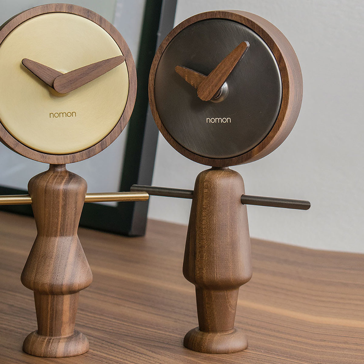 Completing Nomon’s amusing stick figure “couple,” Nena is handcrafted in either solid oak or walnut with a choice of brass or graphite accents. Adding a luxurious and useful touch to a desk or sideboard, the table clock incorporates a precision German UTS mechanism.