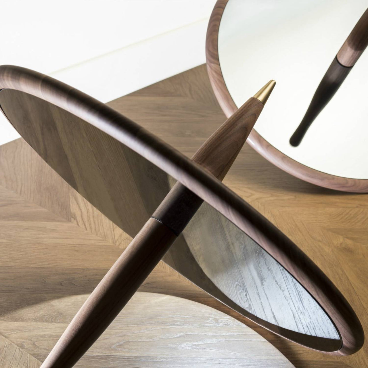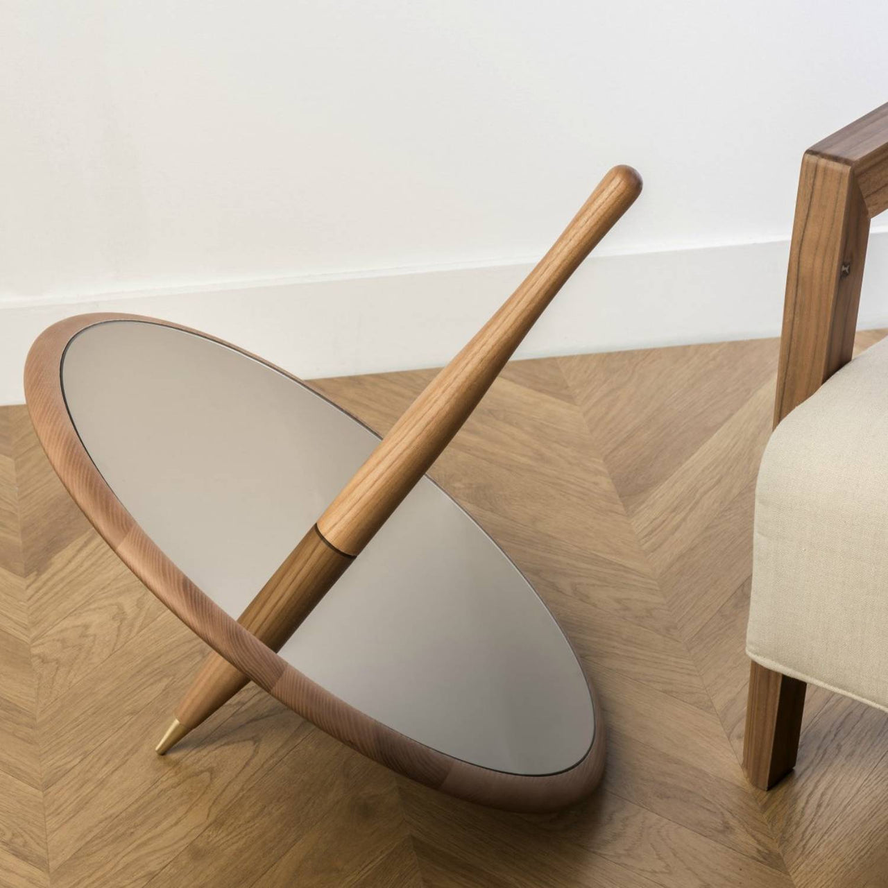 Childhood games give way to an inspired piece of room decor in Nomon Home's outsize version of a spinning top. But a bit of fun also turns functional with Peonza's reflective surface that serves as an angled floor mirror. Artfully handcrafted in solid walnut and solid natural ash, Nomon Home's elegant novelty is finished with polished-brass details and bronzed mirror glass.