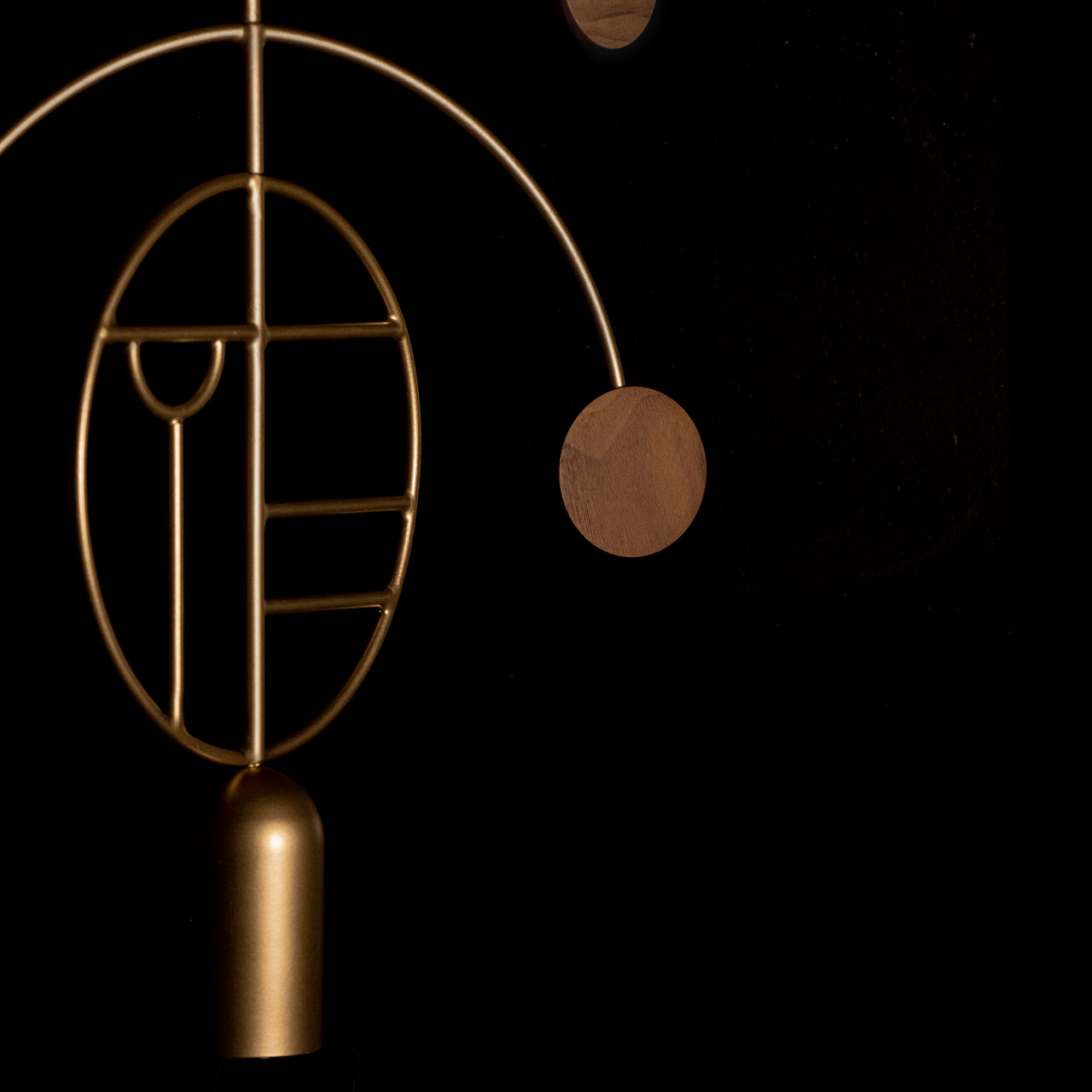 The Wooden Dots Suspension Lamp's components can rotate around the cable, allowing for adjustable arrangements. Available in gold or graphite metal finishes, with circular details in walnut or coordinating colors.