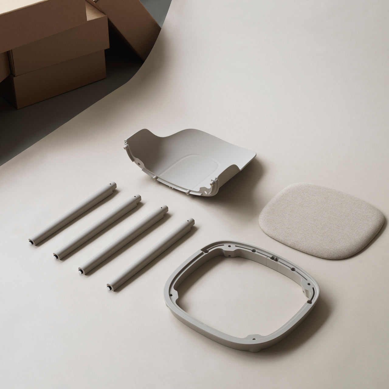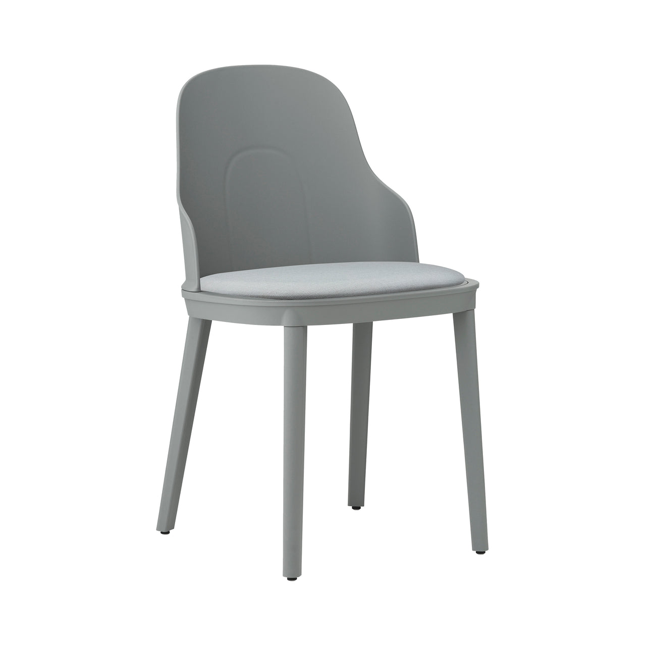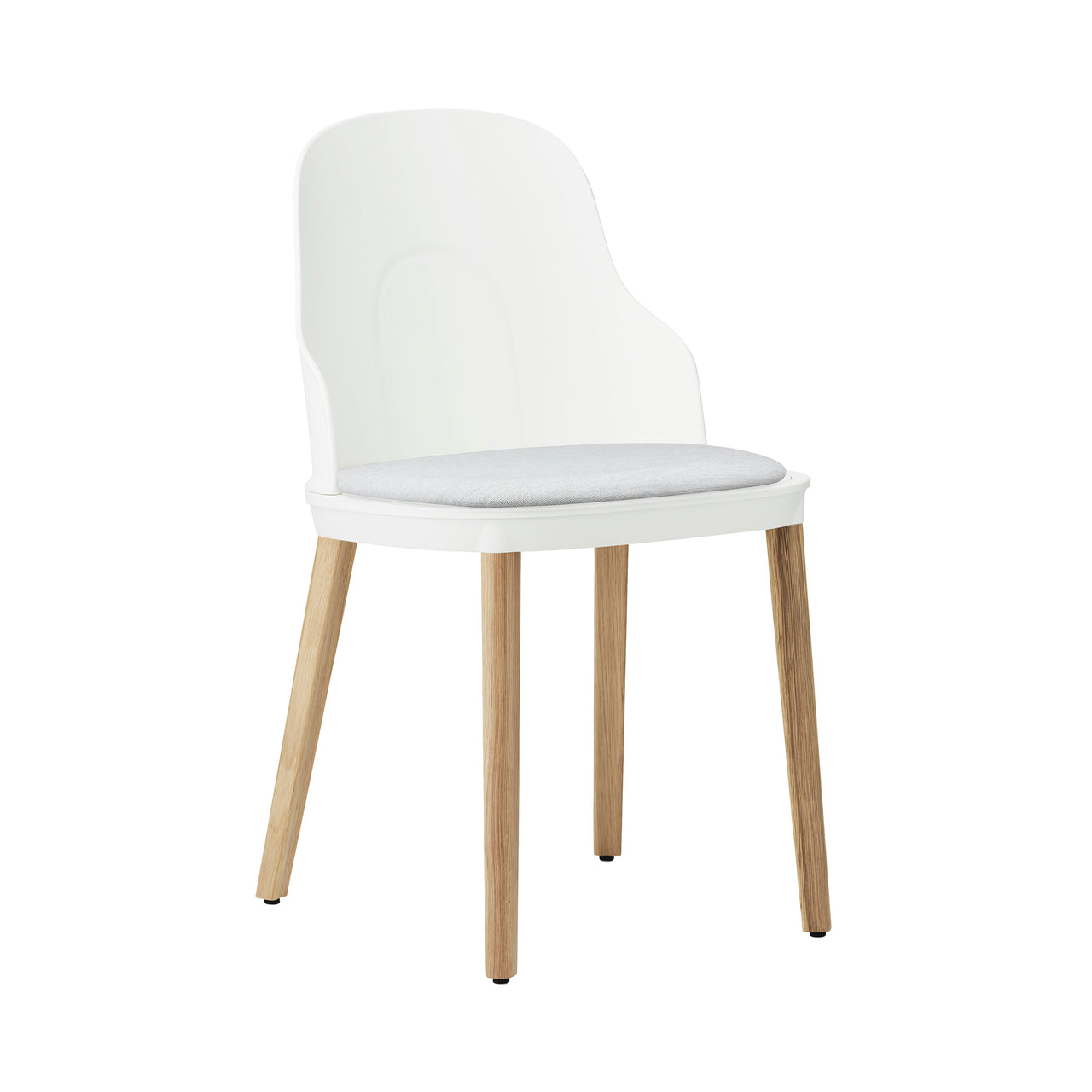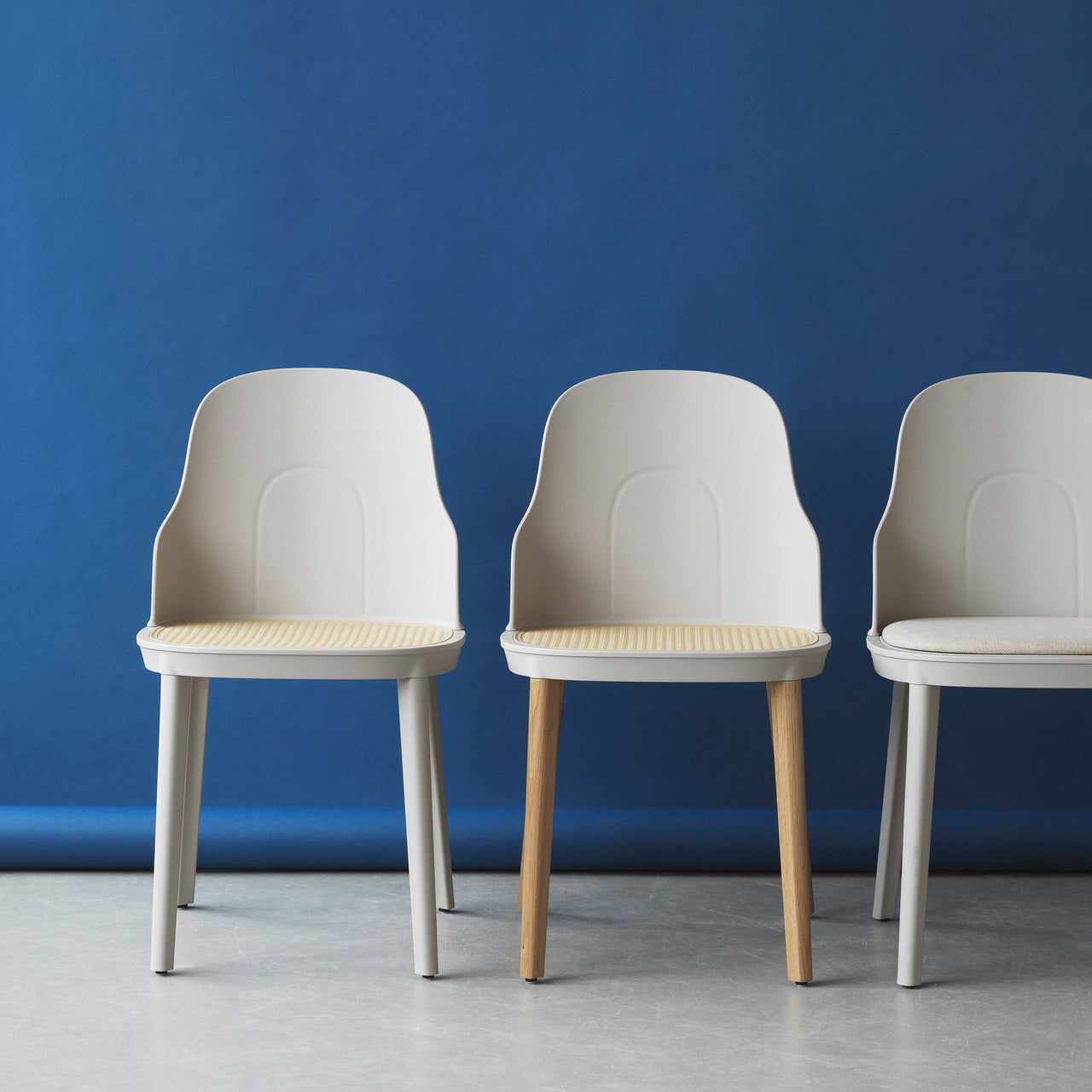 An upholstered seat heightens both the comfort level and the means to personalize Normann Copenhagen's updated café-style chair. Clad in a selection from a choice of fine fabric or leather, the cushioning complements Allez's curved shell with reinforced backrest in Simon Legald's design. The chair comes with a choice of matching plastic legs in a range of Nordic colors or in lacquered oak. Delivered sustainably flat-packed. (Assembly manual included.)