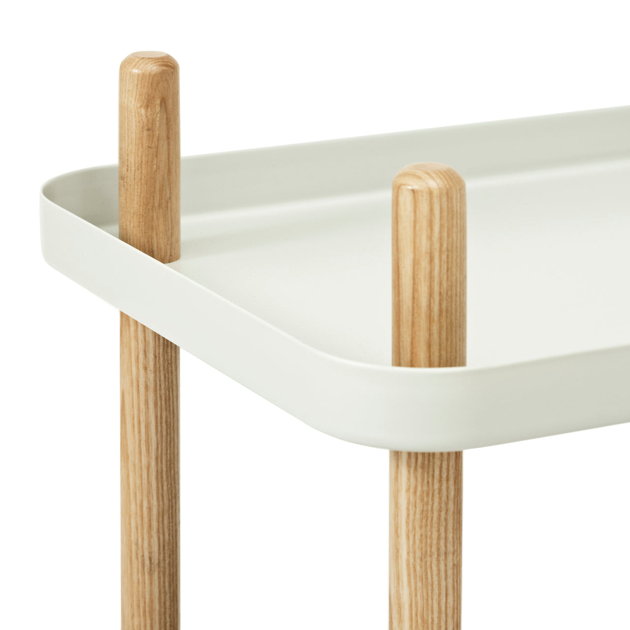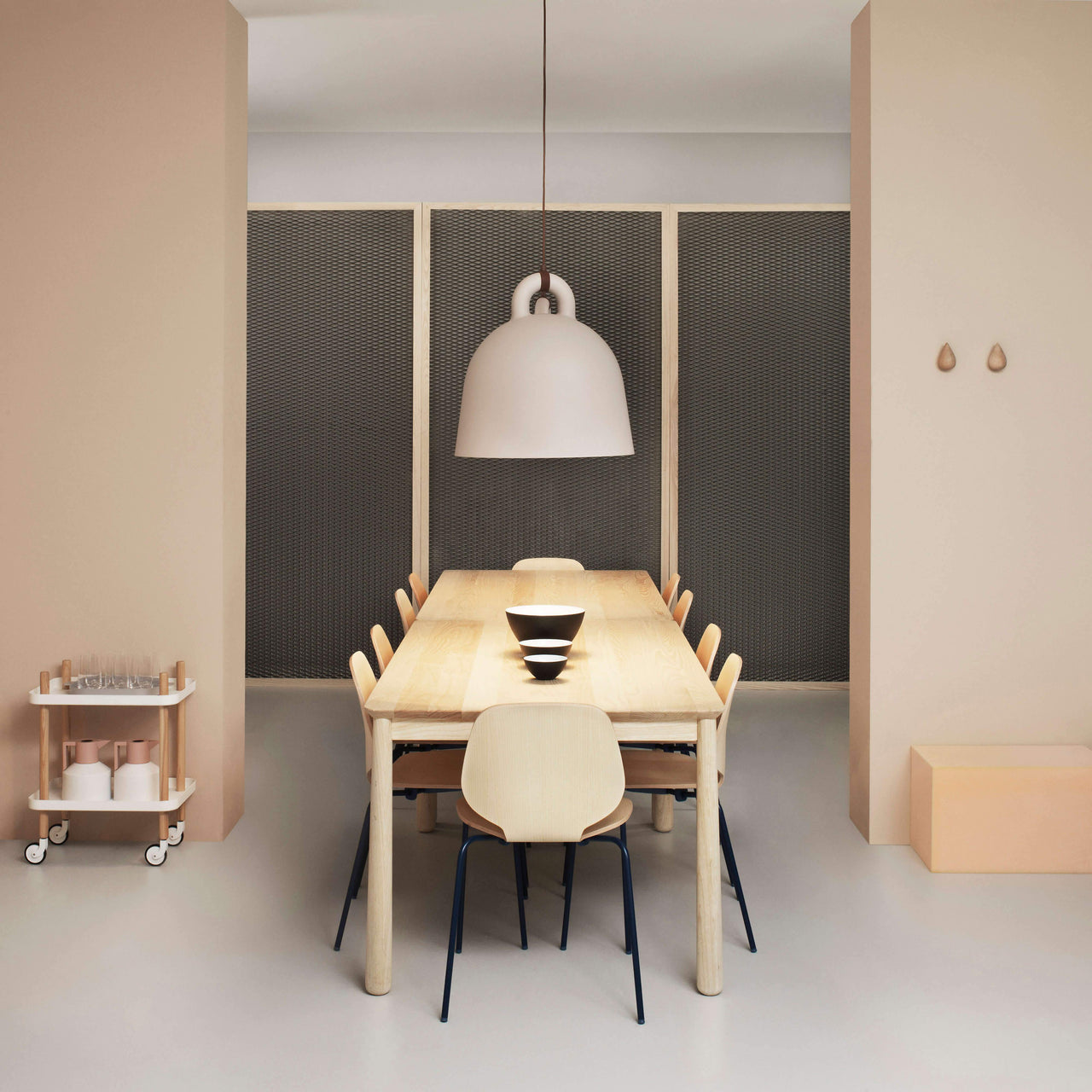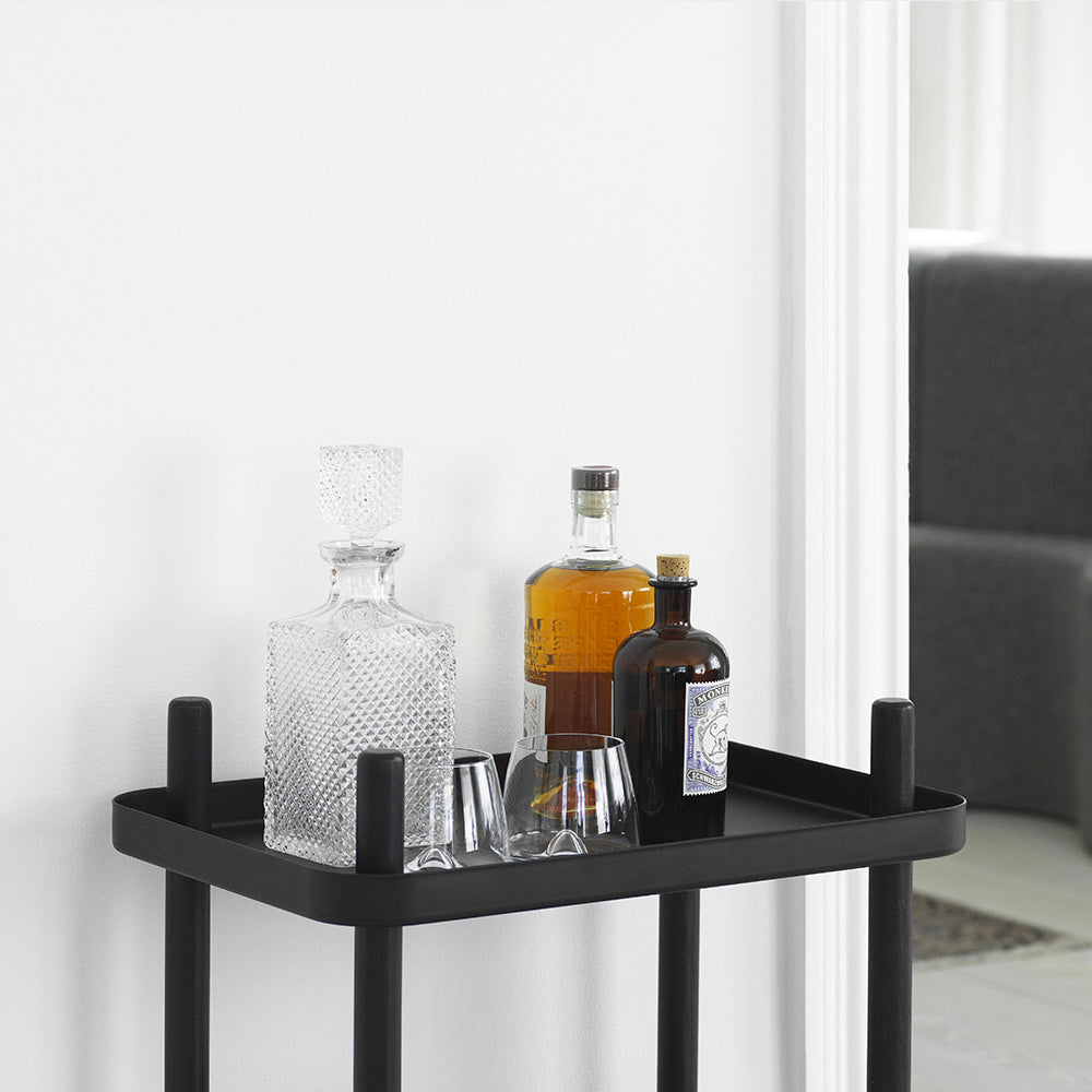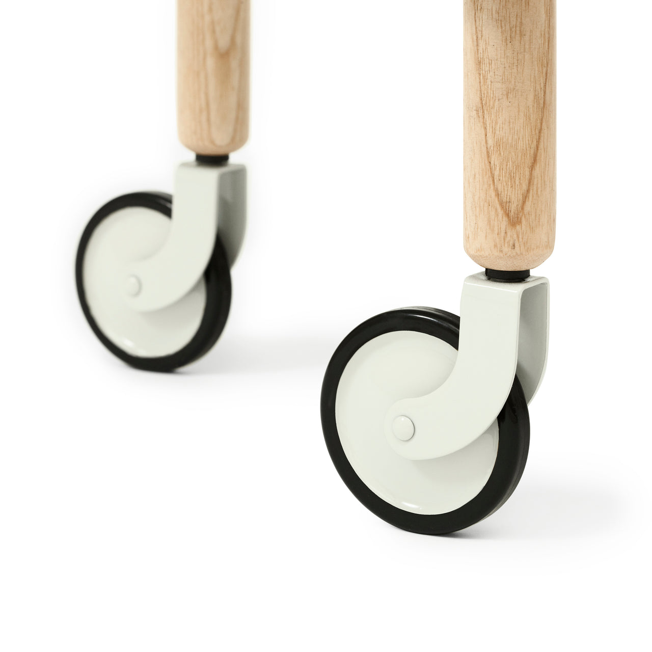 Ideal as a tea cart or end table or even nightstand, this mobile table can move in every direction. Simply pull one of the four ash wood "handles," the posts which serve as legs—on wheels. The matte color softens the effect of the steel surface, adding to its beauty. "Designing is an interaction between craftsmanship and industry, and both elements need to come together," says young designer Simon Legald, who graduated from the Royal Danish Academy of Fine Arts in 2012. His concept is realized by fellow Danes Normann Copenhagen. "Block is a simplification and modernization of the well-known tray table."