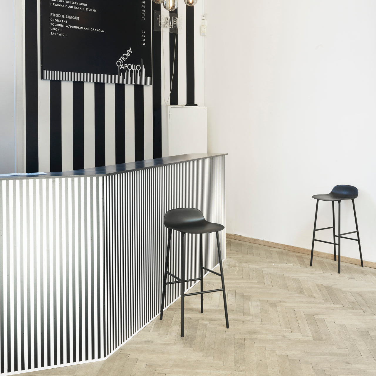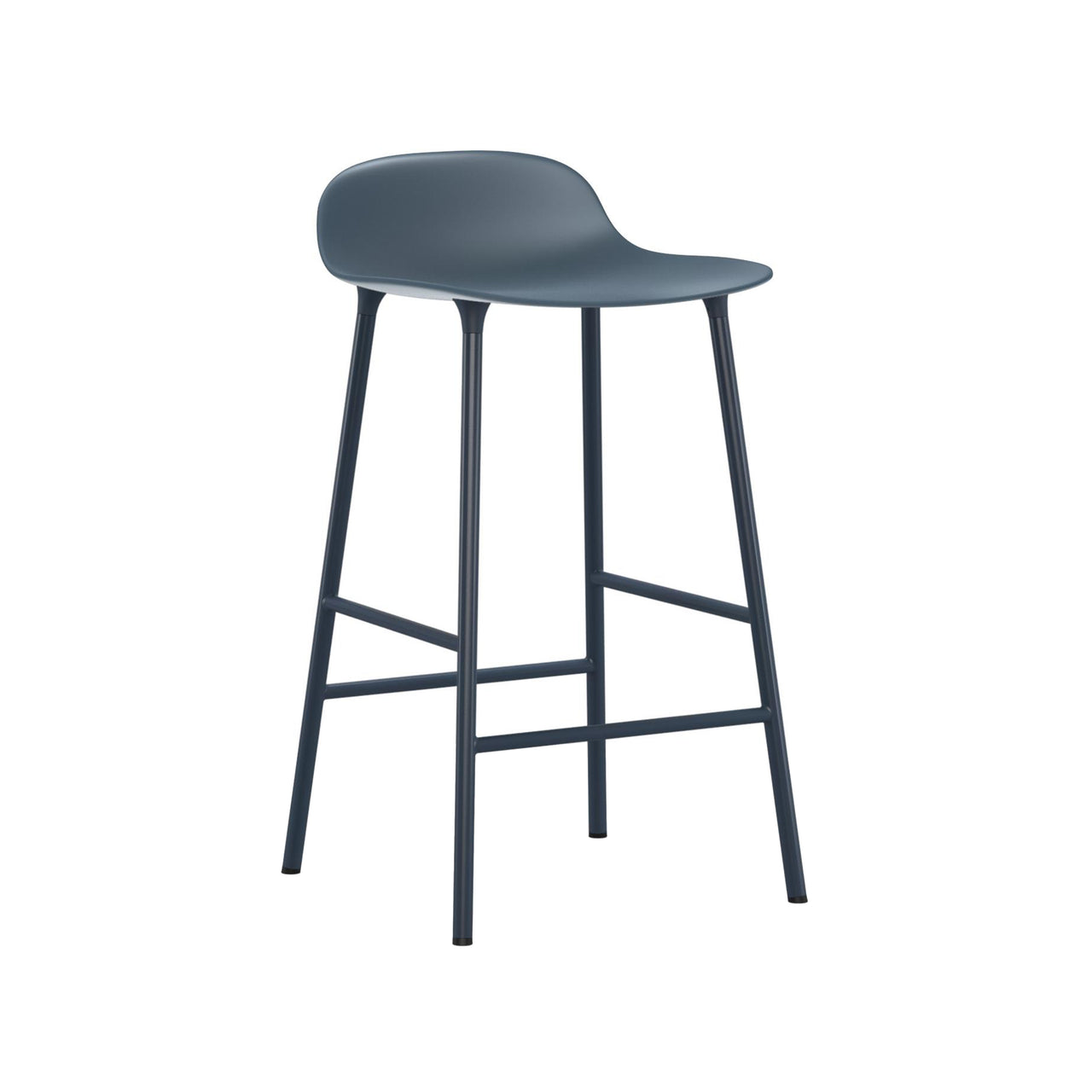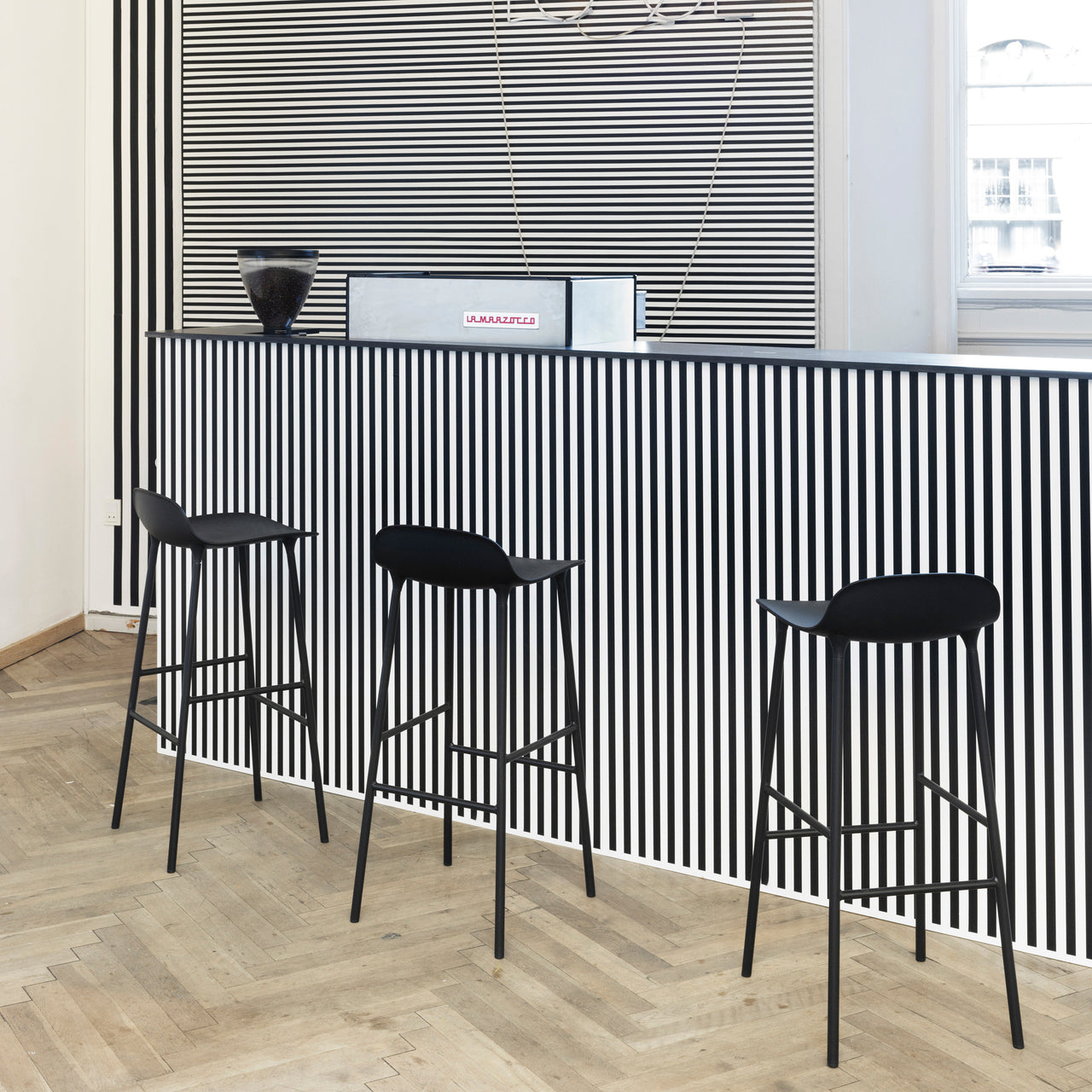 True to Form. All the variations of Danish designer's Simon Legald's Form seating series hew to his original vision. Here, his seamless polypropylene shell chair morphs into a low-backed barstool for Normann Copenhagen. It took more than 20 prototypes developed over 3 years to arrive at a version that would pass Simon's muster, joining the molded plastic seat with a steel frame in an integral fashion. You could say it's a counter-move to hours of seated comfort.