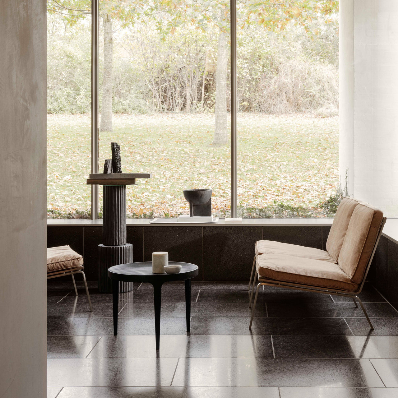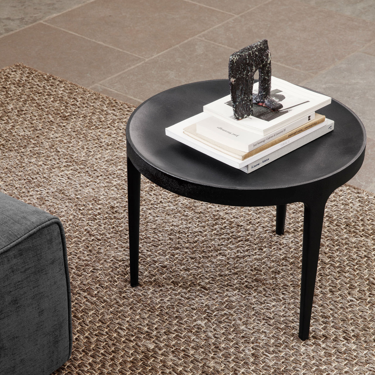 The Ghost Coffee Table stands out with its raw, industrial aesthetic. Cast from aluminum, the table retains the rugged, tactile feel of its mold, resulting in an unpolished, almost primal texture that makes each piece truly unique. Its three-legged structure is both sturdy and elegantly minimalist, with a distinct groove running along the tabletop edge, adding subtle detail. Finished in a deep black powder coating.