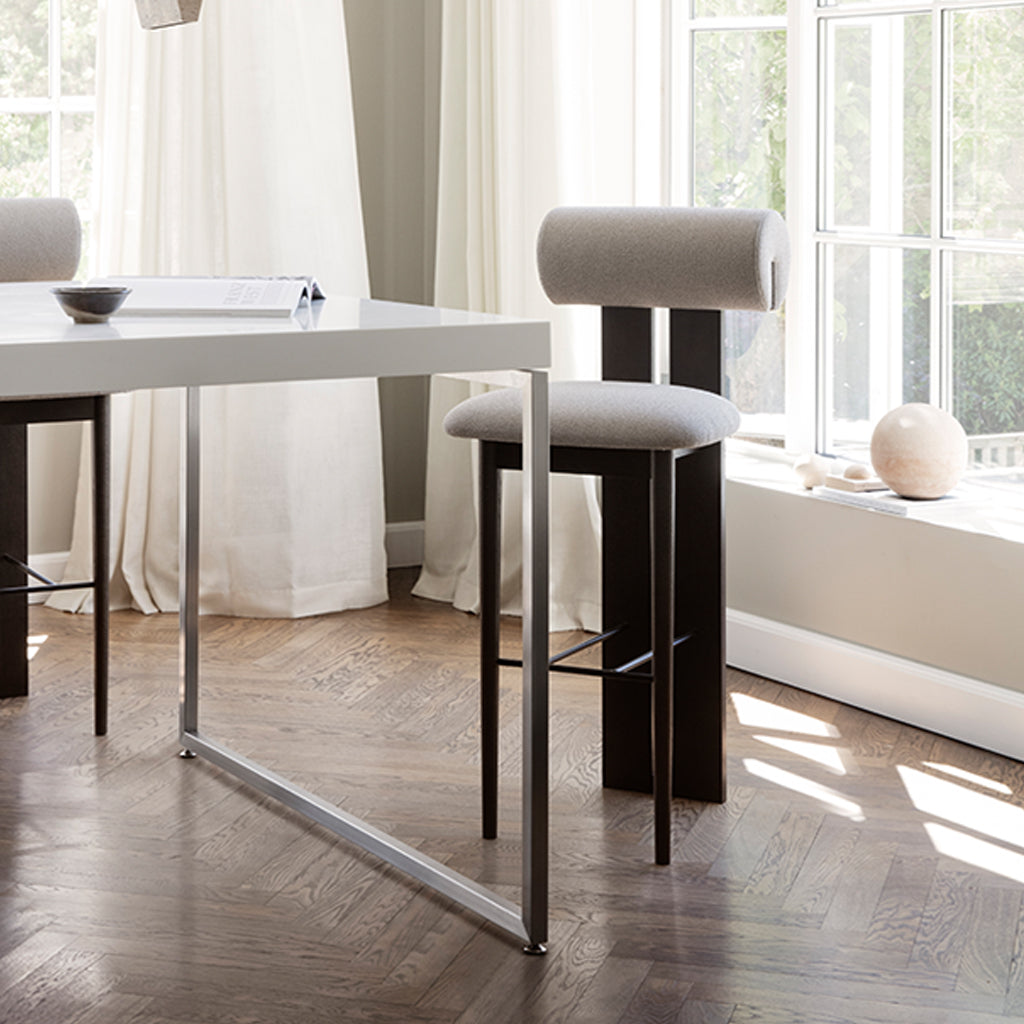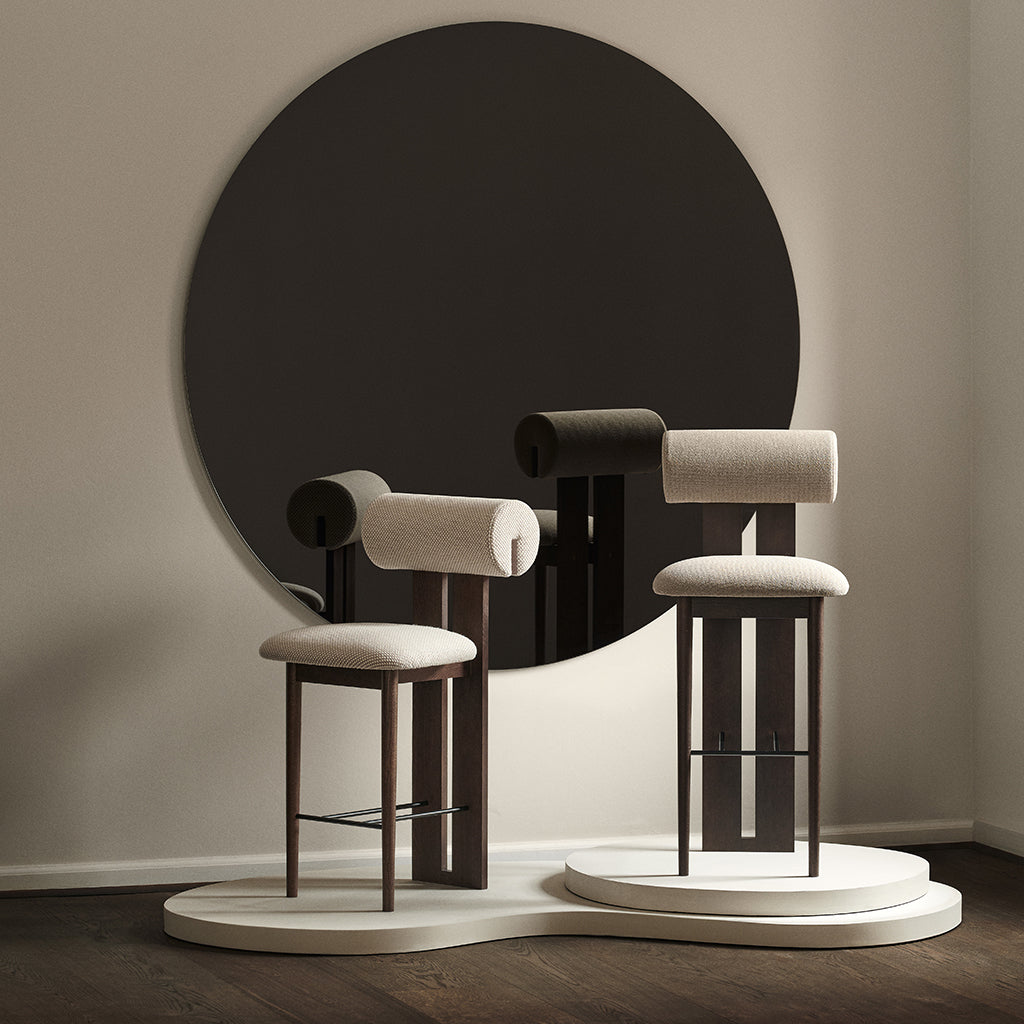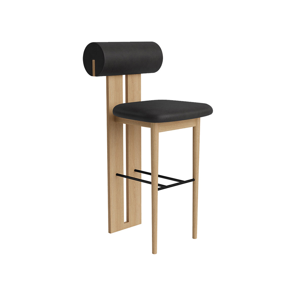 The Hippo Bar + Counter Chair is a fully upholstered version of their playful and sculptural Hippo seating line, designed by Kristian Sofus Hansen and Tommy Hyldahl. Its rounded, soft shapes are inspired by the hippopotamus, with a strong, barrel-like design. The chair features a unique blend of contrasting elements: the soft, upholstered seat and backrest are paired with a robust wooden frame, available in oak finishes like natural, light smoked, dark smokes, or black oak. An iron footrest adds extra comfort and support.