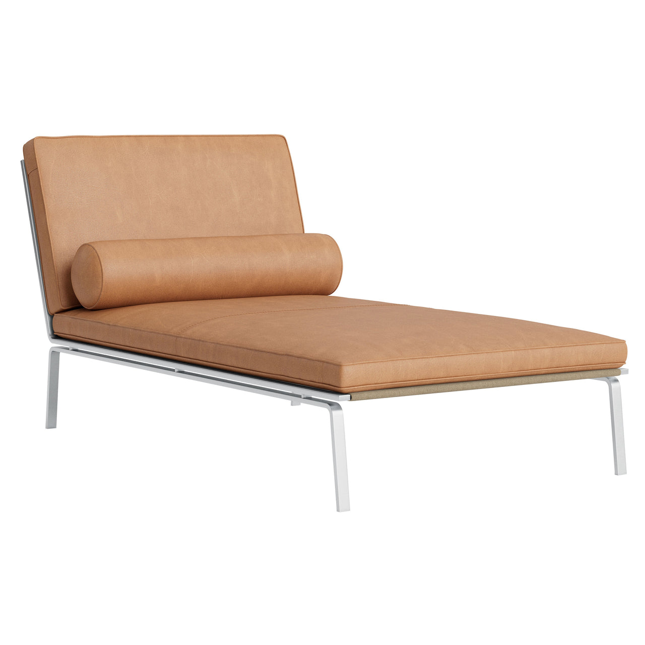 The Man Lounge Chaise Lounge, Designed by Rune Krøjgaard and Knut Bendik Humlevik, is inspired by mid-century Danish design and the Bauhaus movement. The chaises low frame is crafted from sleek stainless steel, which gives it a structured and industrial look. The chaise lounge stands out with its parallel frame structure and visible material joinery, epitomizing a clean and timeless design. Available in a curated range of luxurious fabric and leather and including a matching bolster pillow.