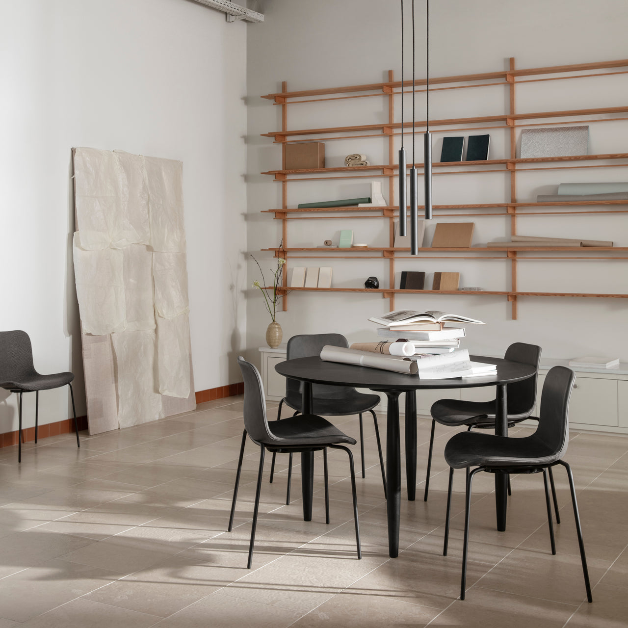 The Oku Round Dining Table is crafted from FSC-certified oak veneer, reflecting the Japanese concept of "Ōku," which means oak. Its thin top, when viewed from certain angles, contrasts beautifully with the sturdy legs, balancing visual lightness with material strength. Its organic, rounded edges soften the overall aesthetic. Available in natural oak, light smoked oak, dark smoked oak, and black oak.