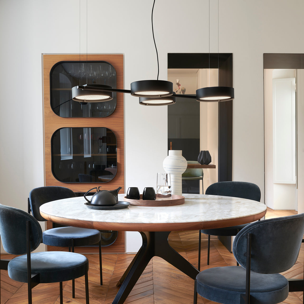 Designer Christophe Pillet’s elegant Berlin series adds a standout suspension light, with 4 of his signature ringed diffusers arrayed across a slender horizontal stem, each rotating 360 degrees. The adjustable round light units offer direct and diffused illumination filtered through insets of sand-blasted wired glass, structured in anodized brass or matte black.