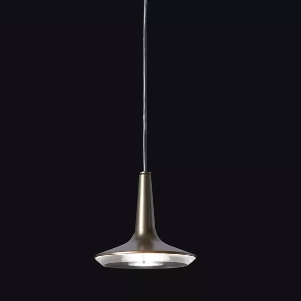 The Kin Suspension Lamp by Oluce, designed by Francesco Rota, features a flared cast aluminum body with slim profiles, closed with a methacrylate disc that diffuses LED light. Available in two sizes and finishes—satin gold glaze and anodic bronze—Kin integrates seamlessly into various domestic and contract environments.