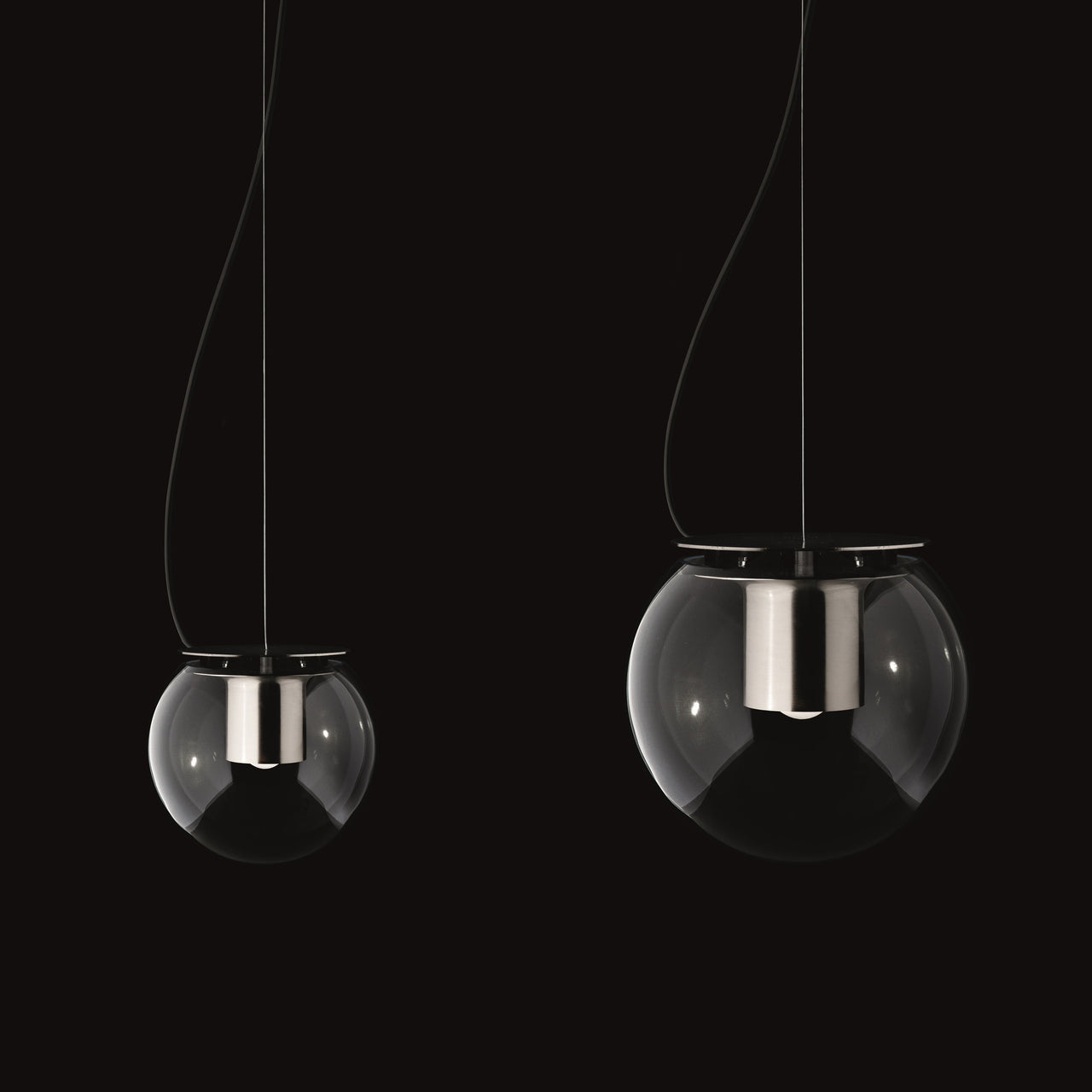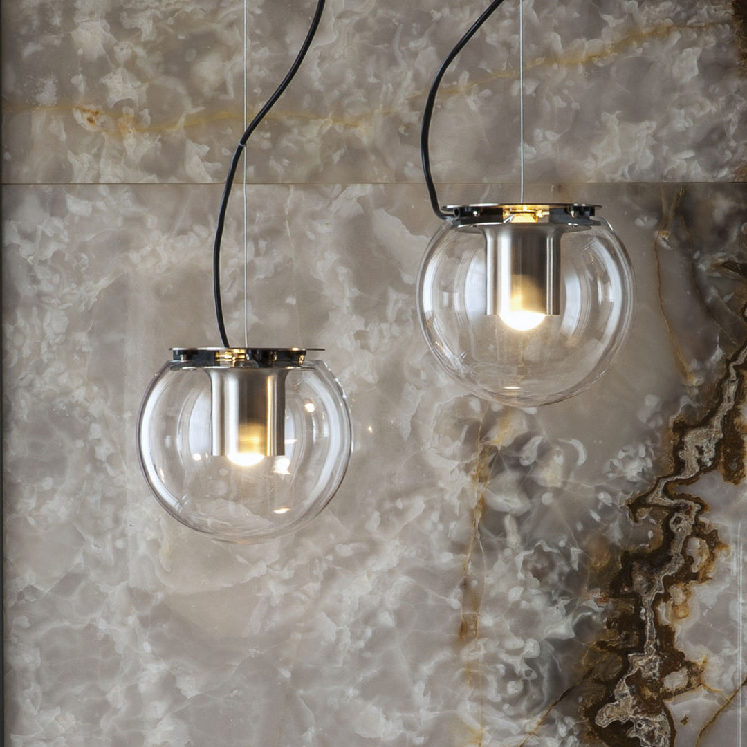 The Globe Suspension Lamp features a transparent blown-glass sphere encasing a cylindrical metal reflector, which provides both direct and diffused light. Available in satin nickel or satin gold finishes, the Globe’s minimalist design emphasizes pure geometric shapes that elevate any room's ambiance. Its suspended design is ideal for adding a sophisticated focal point to dining areas, living spaces, or entryways, embodying Colombo's iconic Italian design legacy.