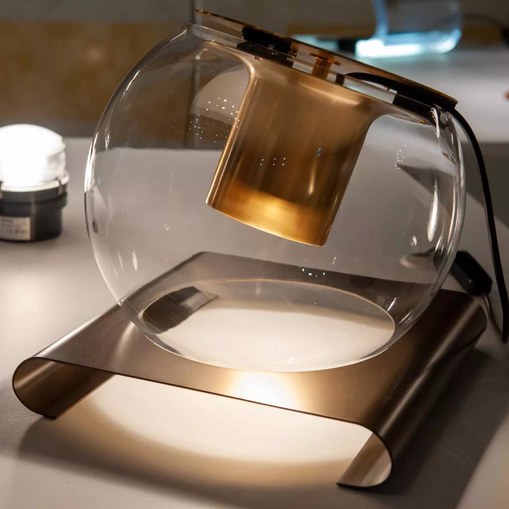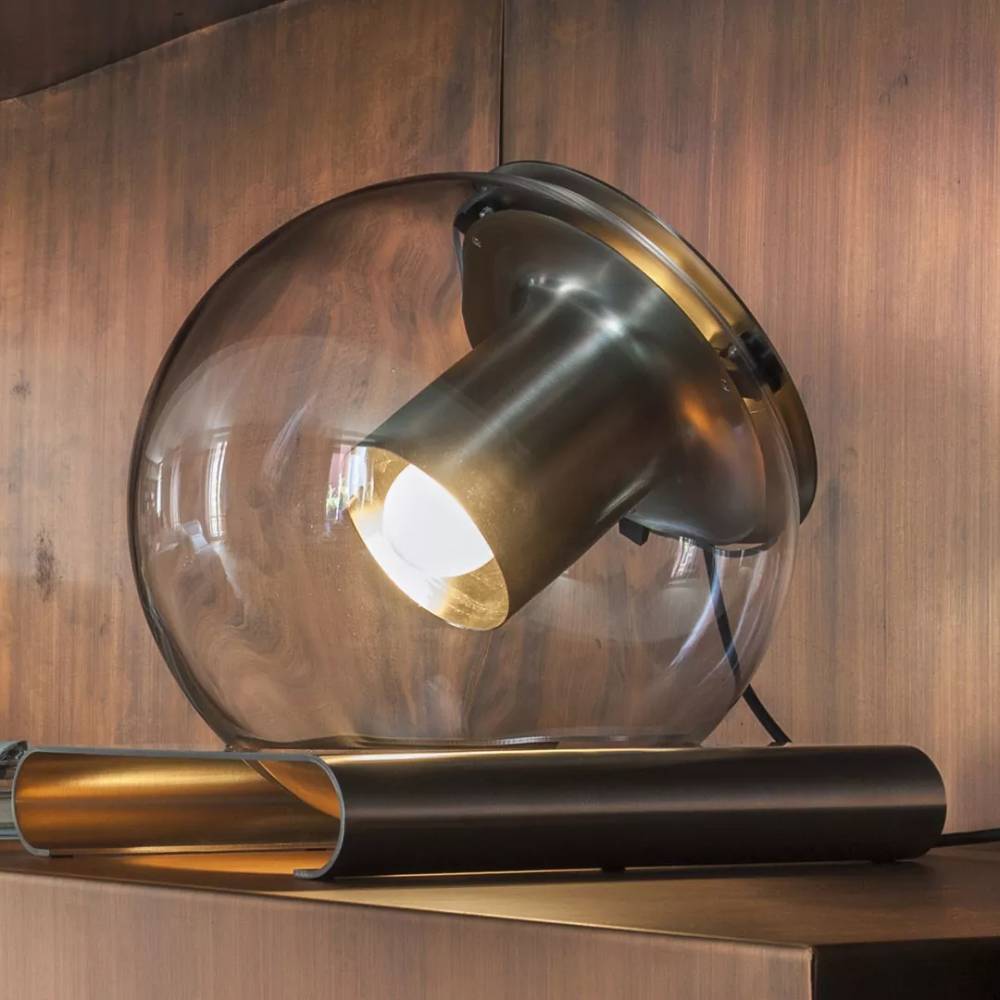 The Globe Table Lamp by Oluce, designed by Joe Colombo in 1964, features a minimalist, transparent blown-glass sphere that encases a cylindrical metal reflector. This design balances direct and diffused light, with the internal reflector focusing illumination outward while enhancing the glass’s soft glow. The lamp is crafted with a satin nickel or satin gold finish. Set on a sturdy metal base.