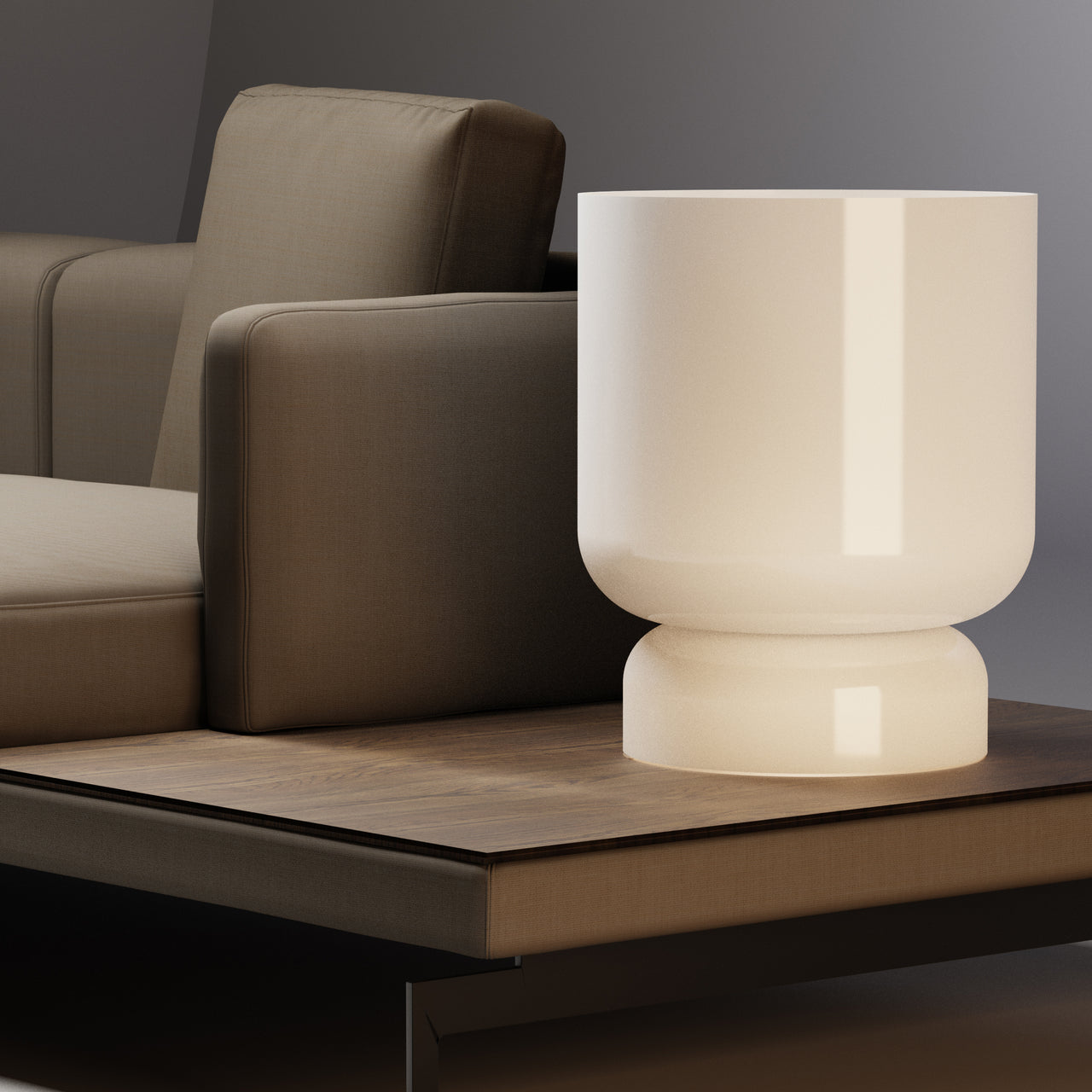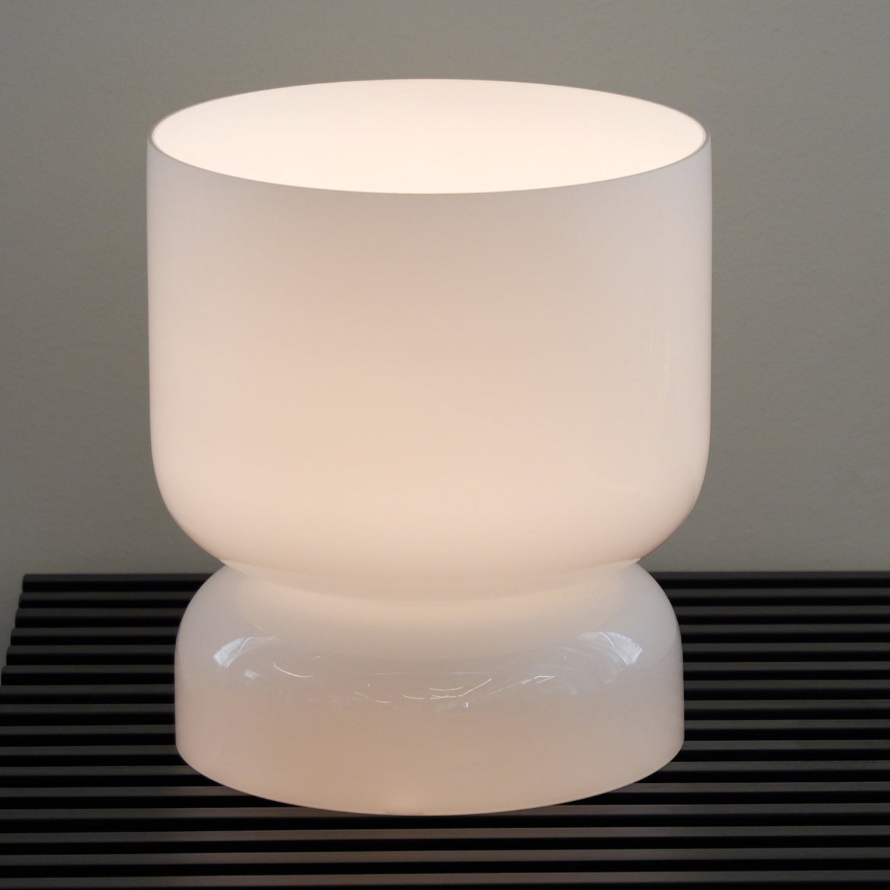 The Totem Table Lamp Double is a LED lighting system featuring two stacked, hand-blown opal glass shades. Its clean, geometric design provides a warm, diffused glow through both the upper and lower shades. The lamp utilizes dim-to-warm LED technology, meaning the light becomes warmer as it is dimmed, enhancing its cozy effect. This model comes with a built-in touch dimmer on the cord for easy light adjustment.