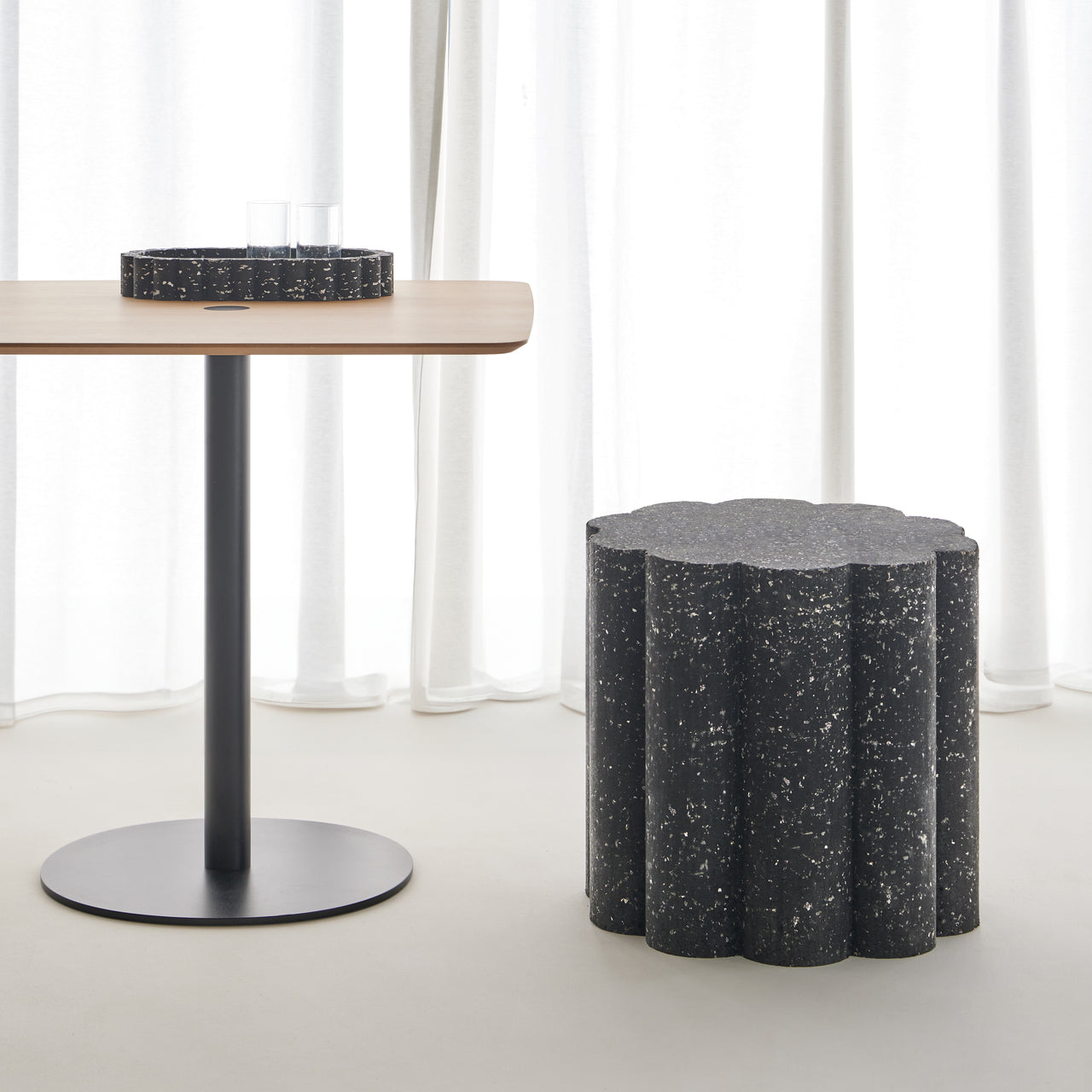 Constructed entirely from recycled materials sourced from the textile and automotive industries, this stool transforms waste into functional art. Its round seat and base are available in black and white, making it suitable for various interior settings. The Nuvol Stool is part of a collection that highlights Punt's commitment to environmental responsibility and circular design principles.