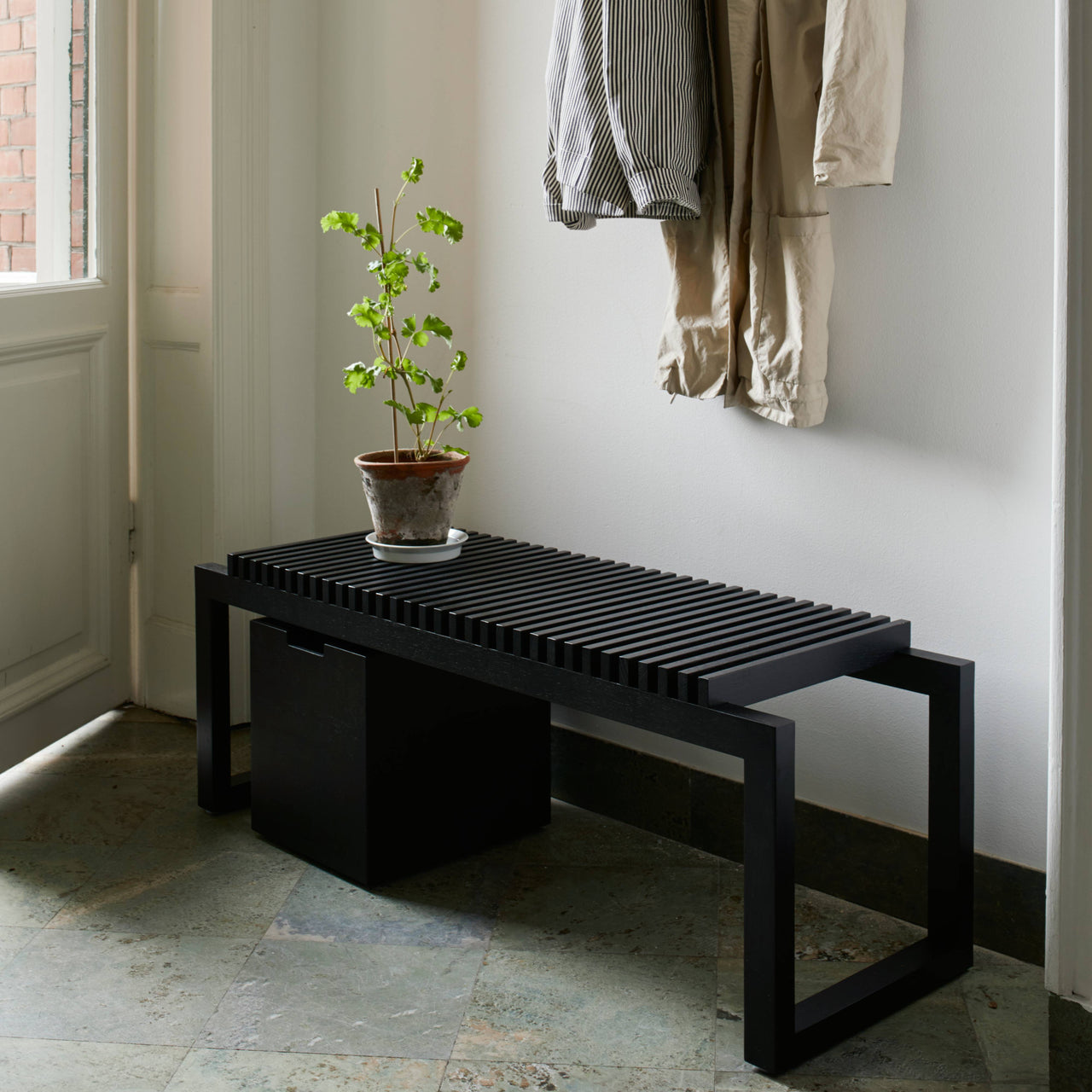 Skagerak’s iconic Cutter collection started with this Bauhaus-inspired bench, originally devised for an exhibition called “Walk the Plank.” Designed by Niels Hvass, it has his hallmark precision in the scale of the geometric frame and the finely spaced slatted seat. The bench is the base for all of the collection’s storage pieces or it functions beautifully on its own—indoors or even outside in the weather-resistant teak version.
