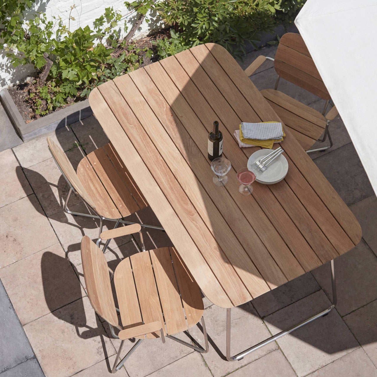 Even with a small armrest for added ease, this Lillium variation still slides easily underneath the table. Design studio Bjarke Ingels Group took the idea of a slatted outdoor chair that lets rainwater drain off from seeing an old disassembled schnapps barrel. The chair's X-shaped metal frame provides stability while also allowing for a bit of comfortable "give" when seated. Fashioned in solid FSC-certified teak and stainless steel to stand up to the elements, the untreated wood seating develops a prized grey patina over time.
