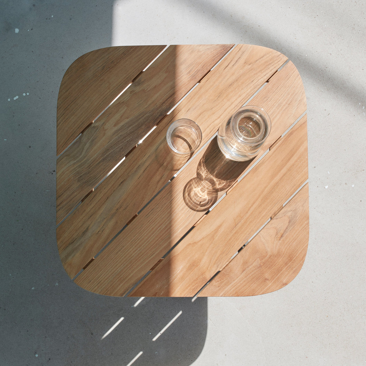 Lilium makes a nod to nature with its organic shape and woody air, with the collection's lounge table making an apt anchor for relaxing outdoor days. Both light and sturdy at the same time, the slender X-shaped frame is crafted in stainless steel, to offset the golden teak surface (which eventually will weather to a marvelous silver-gray.) Emphasizing the rounded square of the tabletop, the warm wood planks are placed at an angle to provide a unique final flourish.