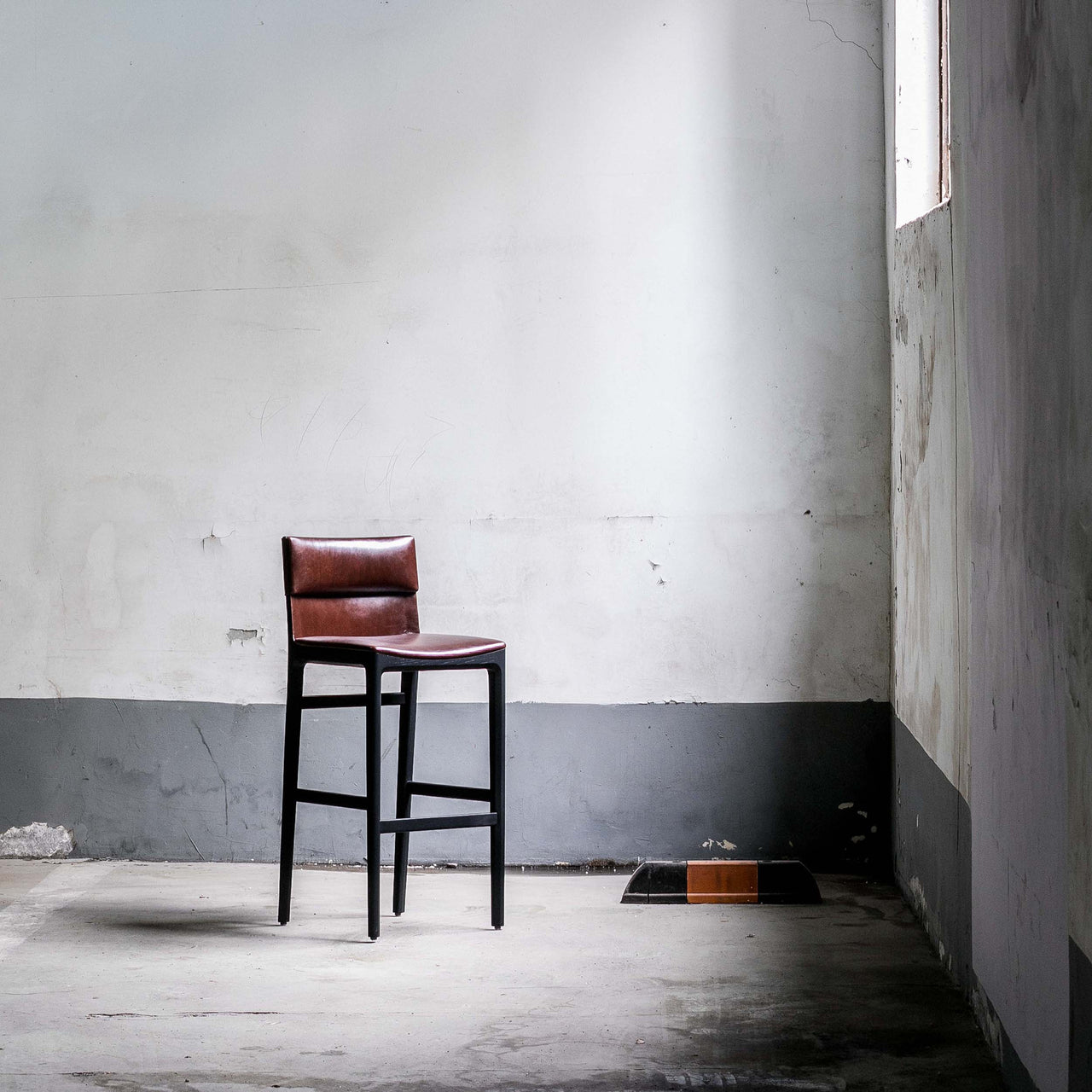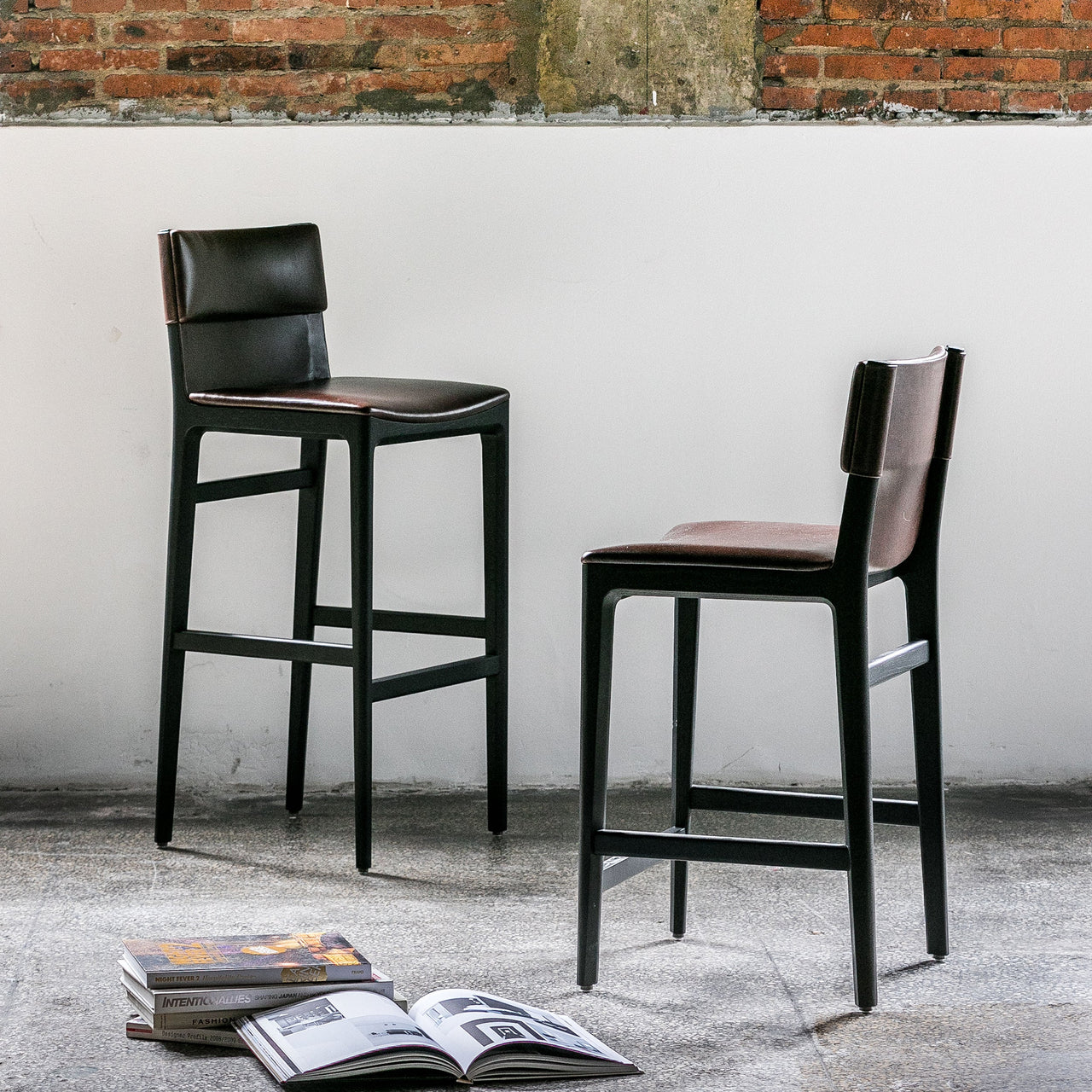 With a similar solid-wood frame cradling the upholstered seat, designers Yabu Pushelberg extend their Taylor conception to a comfortable stool in both bar and counter heights. Imbued with a contemporary look that spans a number of influences, the padding strikes a sporty note with a thicker section across the top of backrest. top. Available in a number of finishes of solid walnut or ash, it’s a handsome addition to residential or hospitality environs.