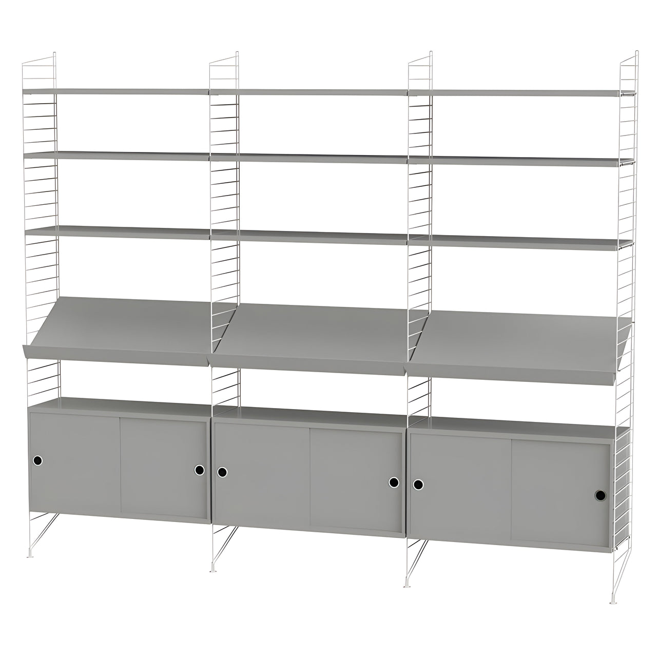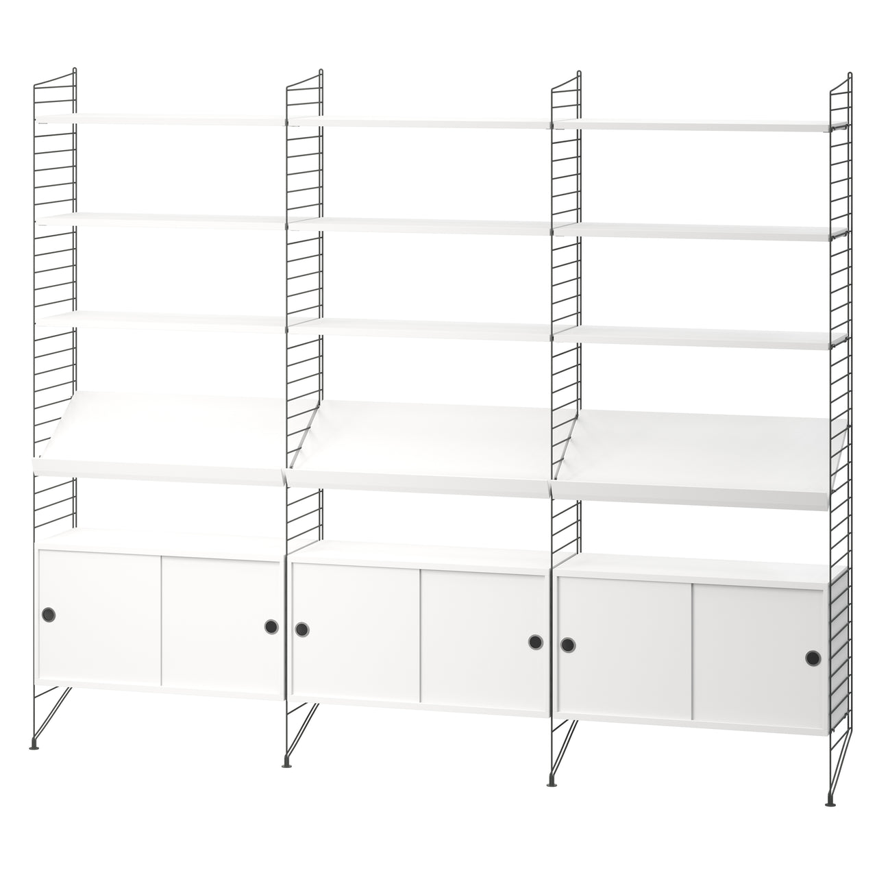 For home or office, String's tripartite preconfigured shelving offers a sweeping expanse for all manner of books and periodicals as well as plenty of room to display cherished objects. And the 3 roomy cabinets with handy sliding doors down below keep other material neatly hidden and the overall look clutter-free. The timeless style of Nils Strinning's system first introduced in 1949 proves just as apt today, with its familiar coated-wire framework and wood elements in the collection’s full range of veneer and painted finishes.