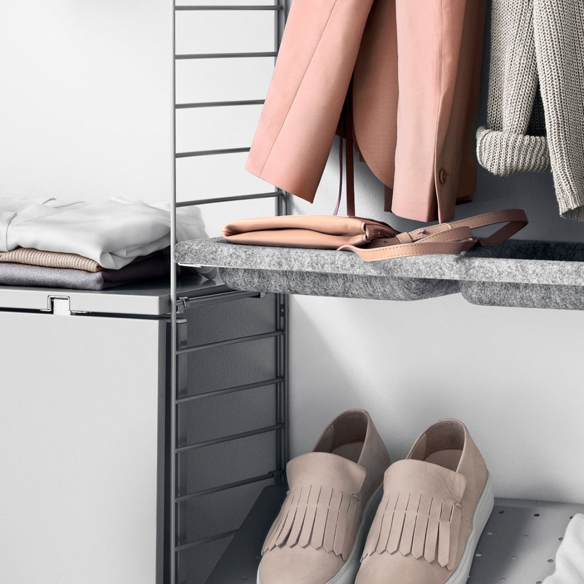 String’s felt-lined shelf with 3 compartments is perfect for organizing smaller items that don’t belong on a flat shelf. As a nesting place for jewelry or a wallet and change in the bedroom or for stashing assorted office supplies, its soft surface protects those easily scratched pieces while muffling any sounds and providing another option for organizing bits and bobs. Available in a choice of 3 variegated colors of felt over powder-coated steel.