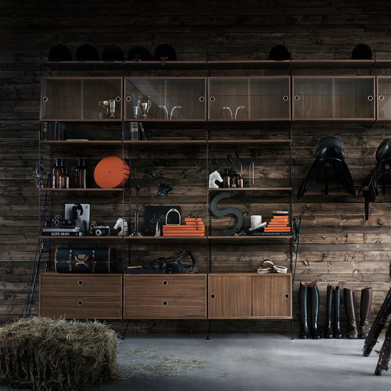 For hidden storage in any room of the house, the option of a cabinet with sliding doors is readily integrated into a String configuration. Available in large or small sizes, the unit comes in wood veneer or solid-color MDF, both with a lacquer finish. Swedish design icons Nisse and Kajsa Strinning first unveiled String in 1949 and with an array of options it continues to prove its enduring appeal.
