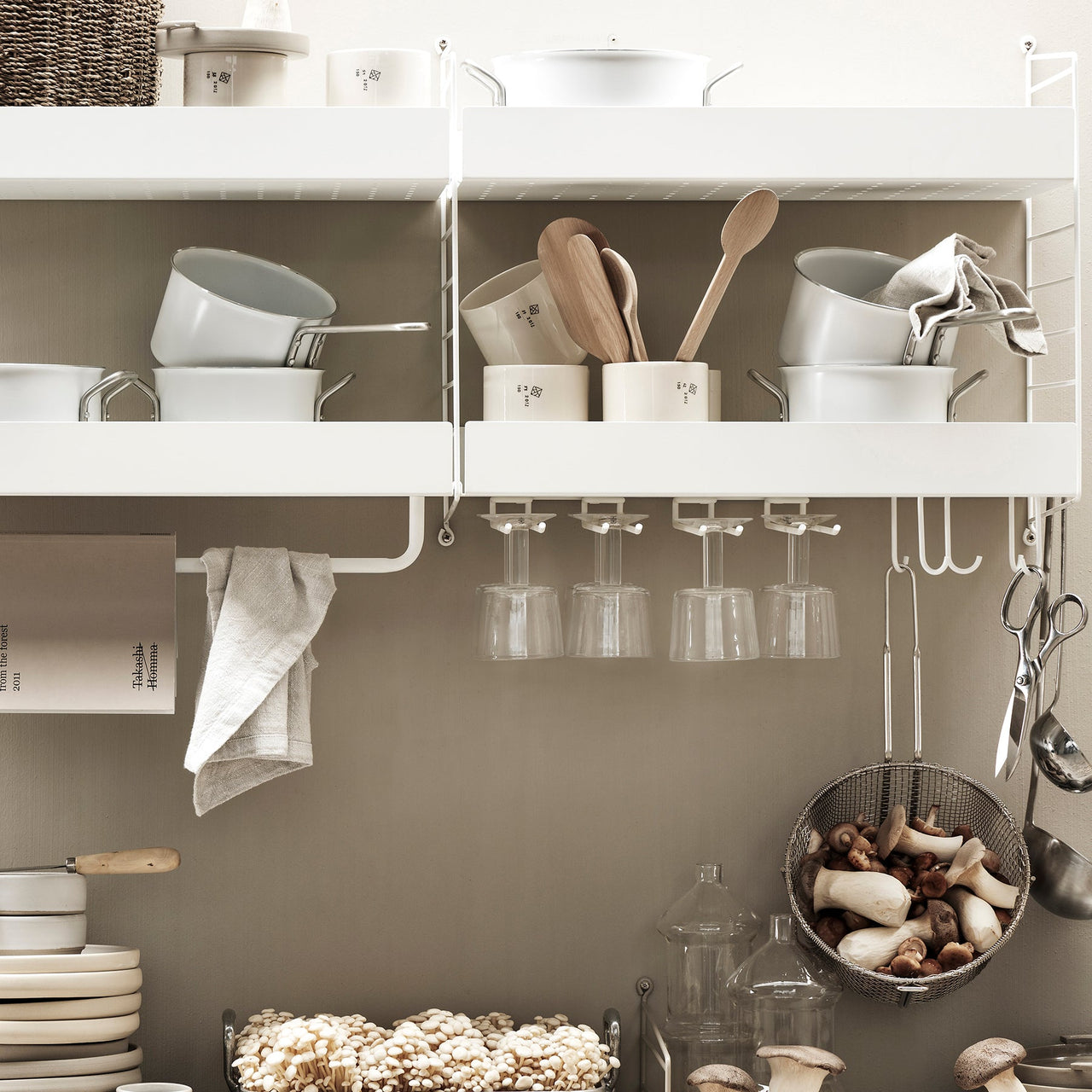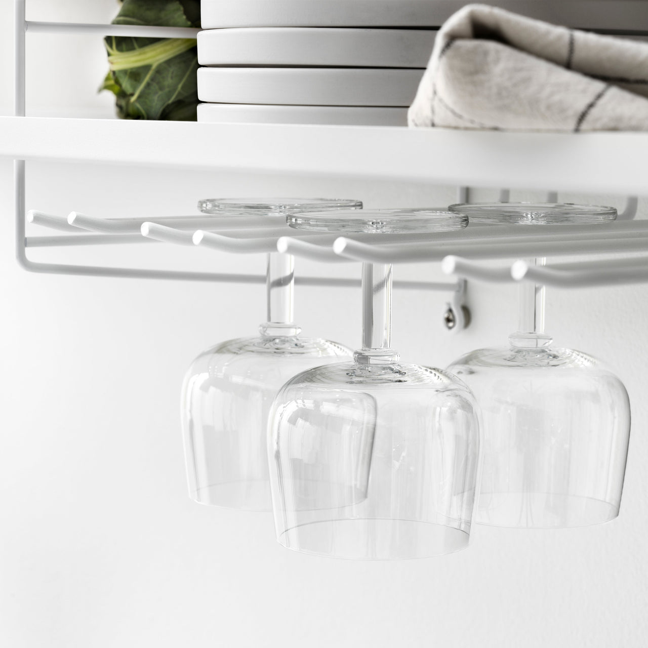 String adapts the classic stemmed-glass holder to use with the storage system's metal or galvanized shelves. A must in any kitchen or entertaining area, the rack is available in either small (2-3 wineglasses) or large (3-4 wineglasses) versions. Each String accessory set contains 2 hanger racks, each equipped with double rails and the standard 58-cm-wide metal shelf can fit up to 3 hanger racks and the 78-cm shelf wide can fit up to 4 racks.