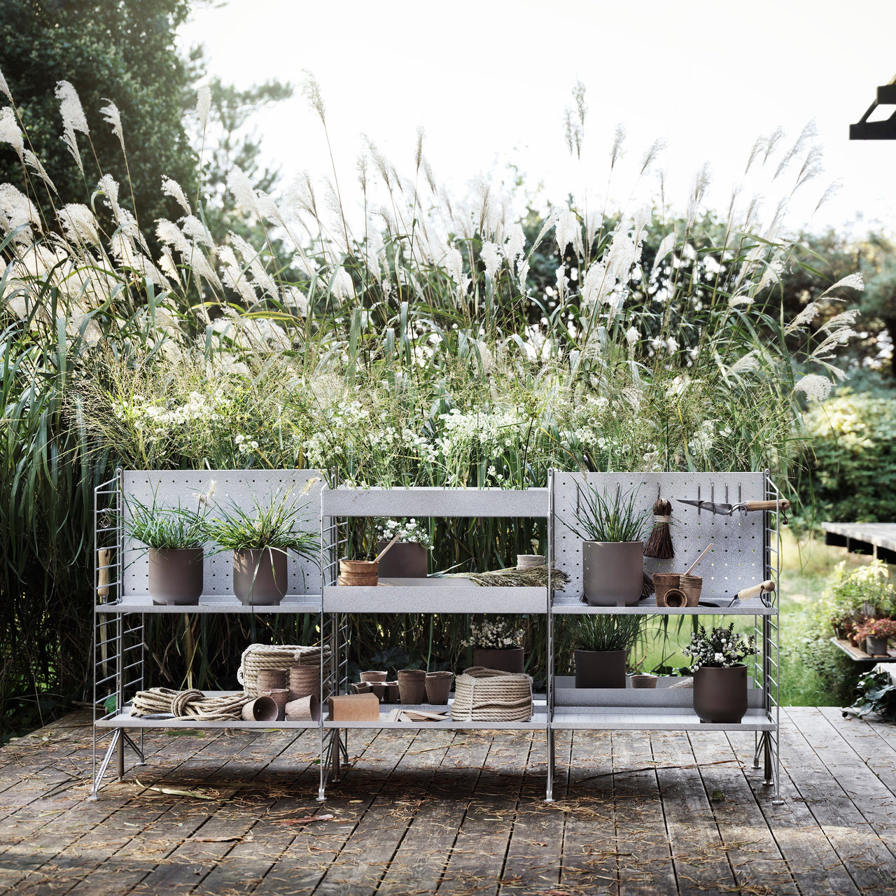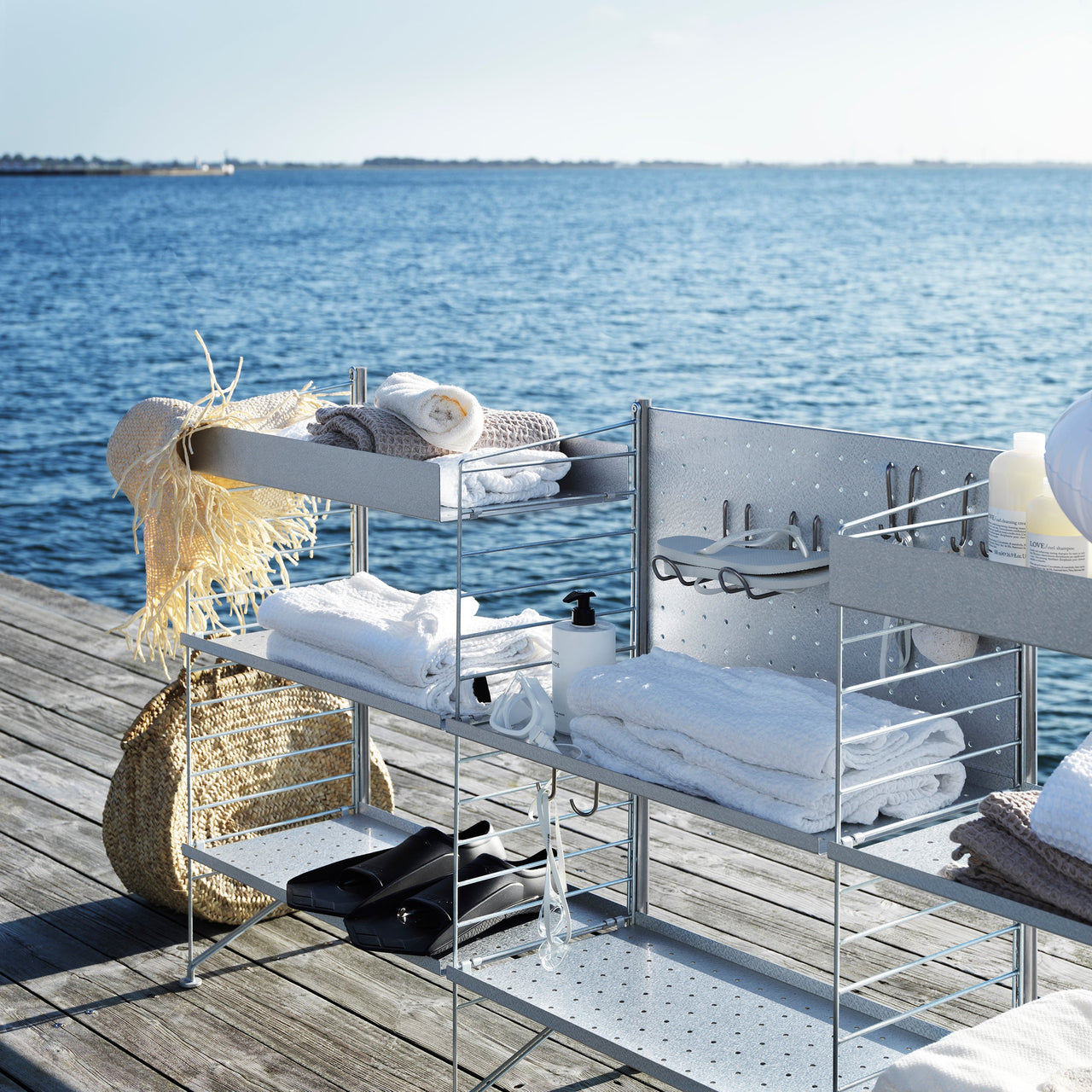 For extra functionality, String offers a shelf option in fine-textured coated steel that allows for an expanded range of storage solutions. The metal shelving can accommodate accessories like hooks, rods, hangar racks and bottle trays. Available in 2 versions, with either lower or higher edges, to provide maximum flexibility for all manner of customized installations.