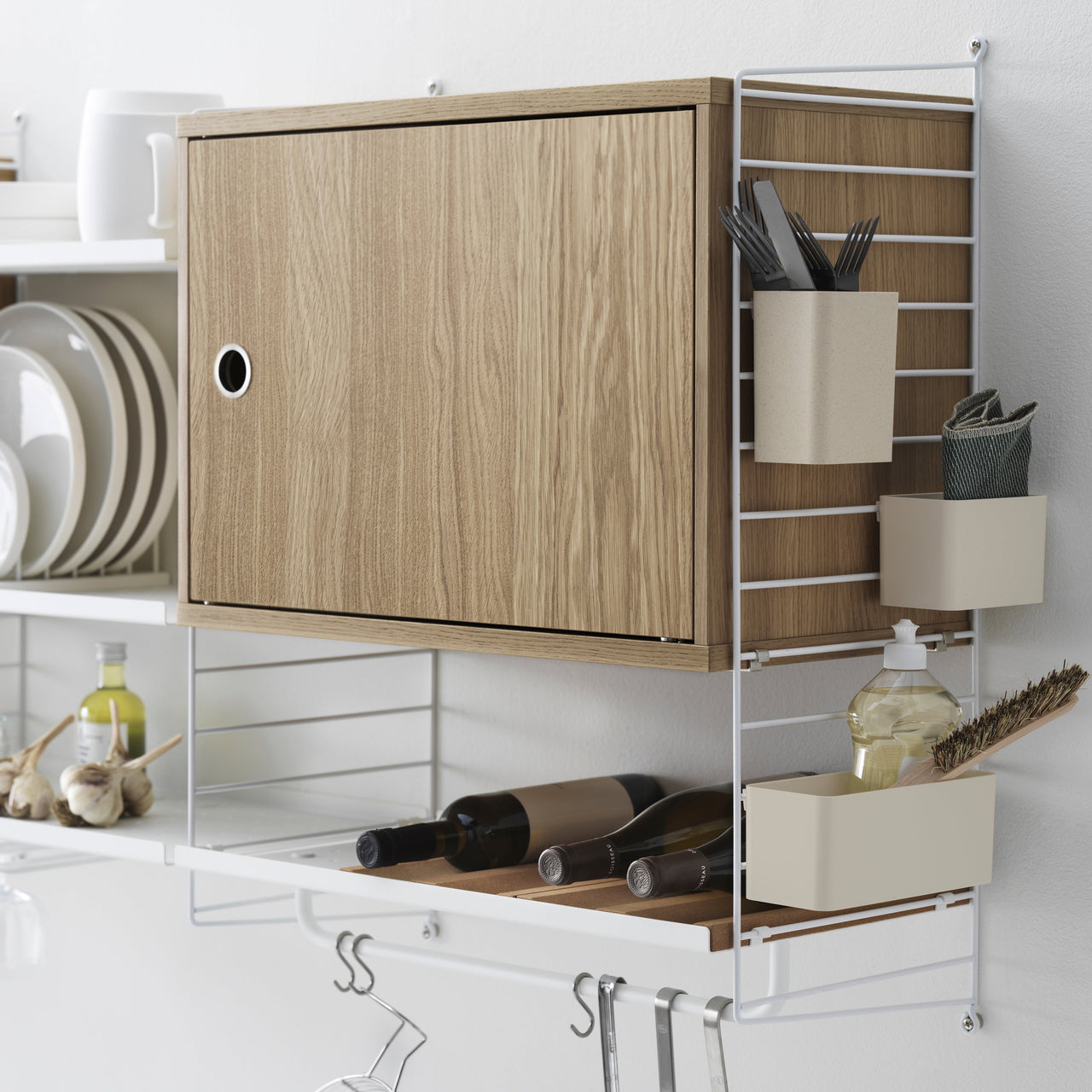 Known for its characteristic wire panels, designers Nisse and Kajsa Strinning's iconic shelving system adds a set of 3 convenient organizers. Made from a biocomposite plastic material with 40 percent wood fiber, they can attach to either the String System's 30-cm-deep wire panels or the wire screen from Works. The add-on holders make it easy to store desk accoutrements in the study, utensils in the kitchen or assorted bits and bobs in any room in the house.