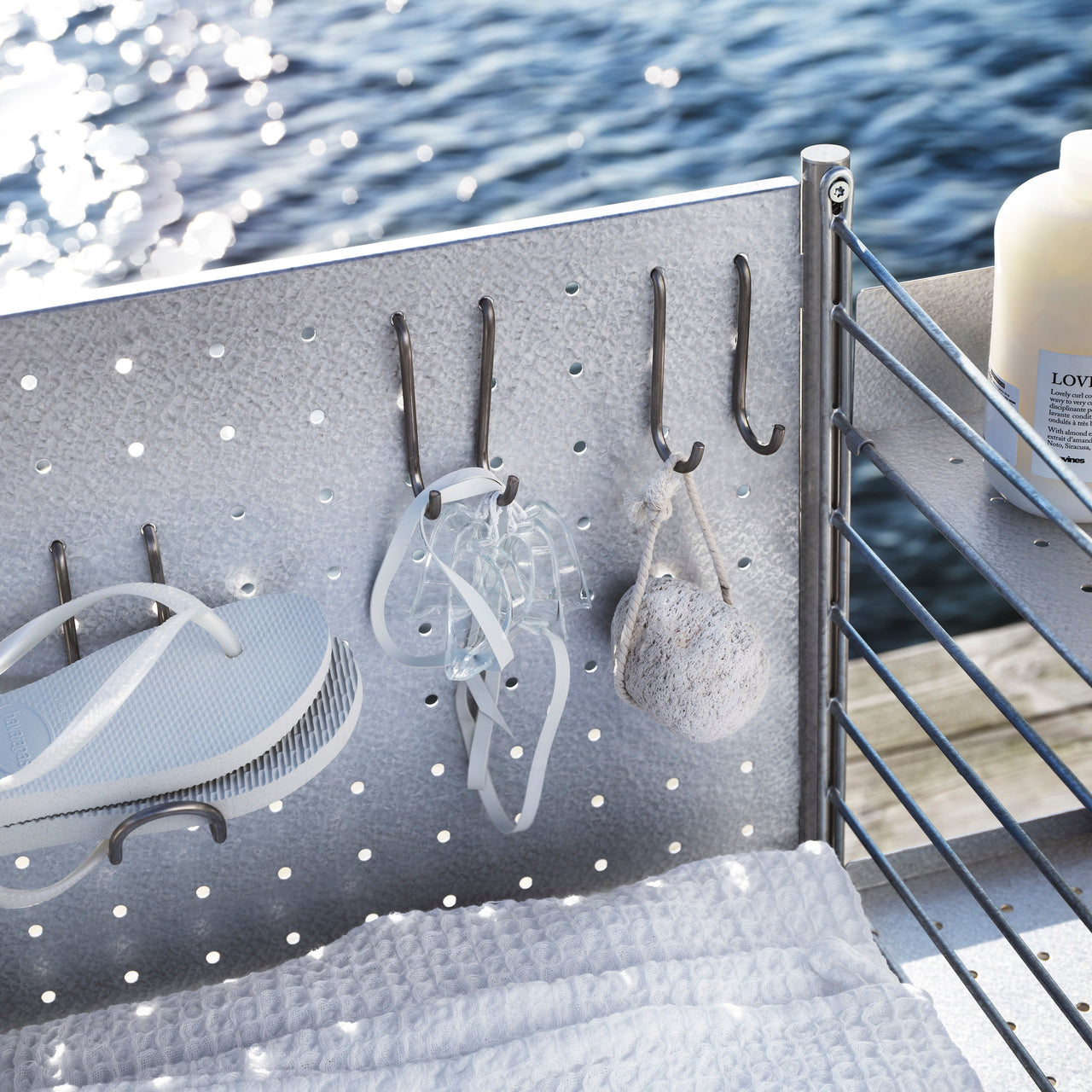 In single- and double-prong versions, String's add-on Vertical Hook is designed to fit the back panel of the freestanding outdoor shelf. Whether it's garden tools, grilling implements or any other accoutrement to outdoor activities, the hanging accessory helps keep things conveniently organized. Made of stainless steel to withstand all types of weather and sea air, the single hook comes in a package of 4 and the double in a package of 2.