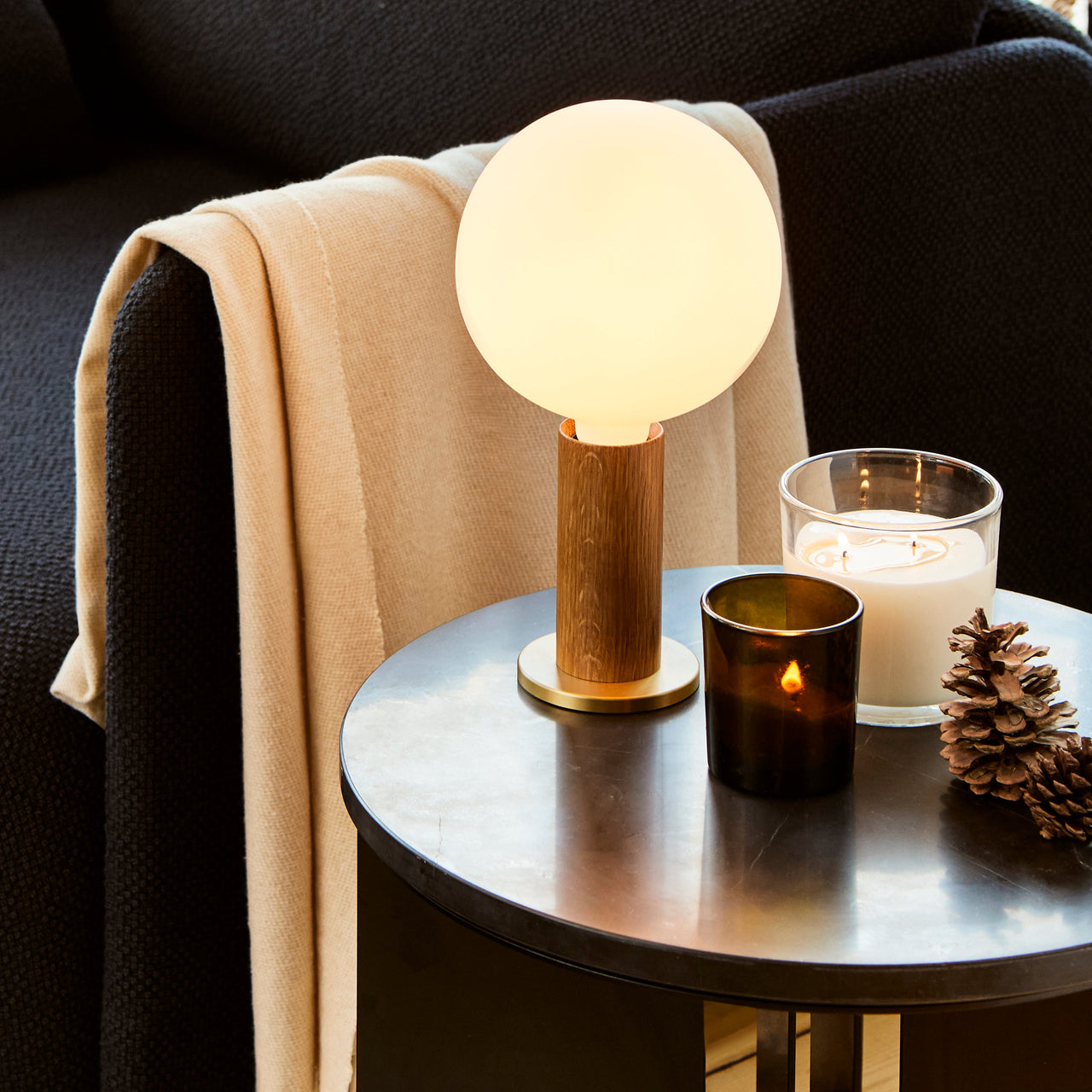 Combining a cylinder of solid wood with a satin brass or gun metal base finish, the versatile table lamp Knuckle version comes complete with a tactile inline dimmer to create accents of light and color. Paired with Tala's iconic Voronoi I or the Dim to Warm Sphere IV LED bulb, it’s a focused, functional choice that’s ideal for a desk, bookshelf or bedside table.