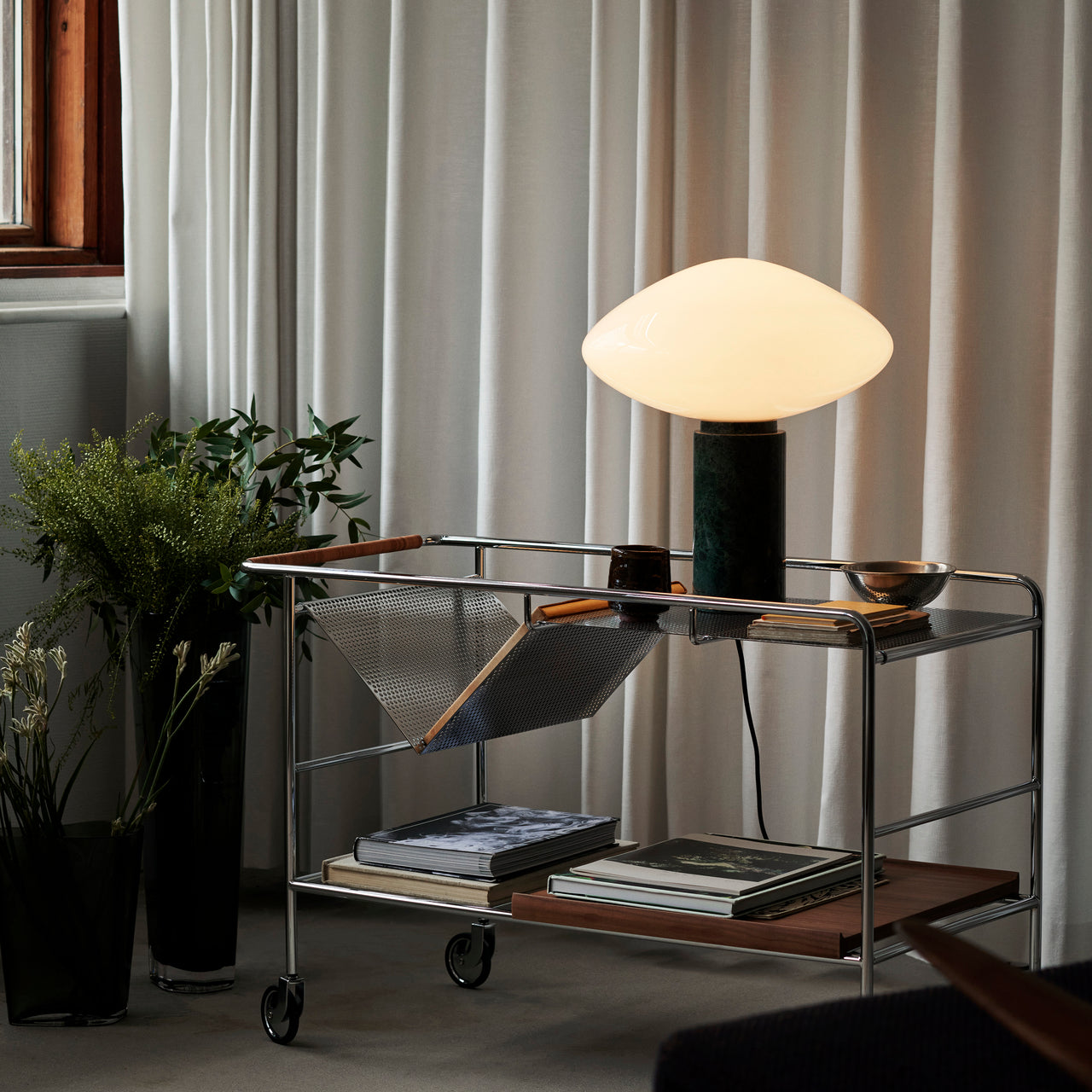 Stockholm's Note Design Studio embraces WFH with a sleek storage unit to house creative necessities like books, magazines, drawings and objects. Alima is a streamlined rolling trolley with a distinctive V-shaped compartment built into its surface that allows stacked volumes to be easily displayed. Elegantly crafted from bent and welded steel tubes in black or chrome finish with leather cording around the handle, it also features an oak or walnut veneer tray with milled edges in solid wood