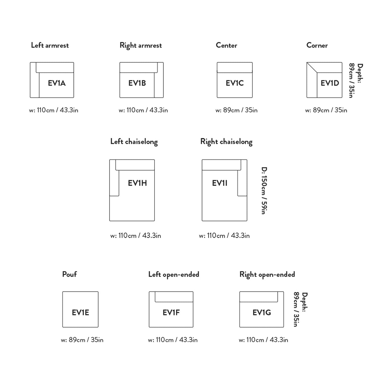 - EV1H/1I Left /Right chaise long: 27.6" h x 43.3" w x 59.1" d (70x110x150cm)