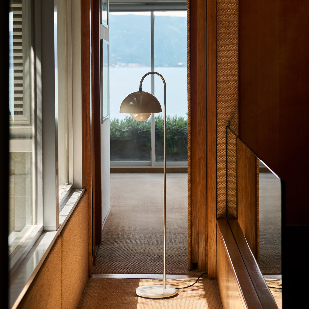 The Flowerpot VP12 Floor Lamp by &Tradition continues Verner Panton’s iconic Flowerpot series, first introduced in the late 1960s. It showcases a unique design featuring two hemispheres facing each other, casting a soft, downward light. The base reflects the spherical shape of the shade, creating a unified and sculptural look. With its sleek and compact form, the lamp is ideal for placement beside armchairs, sofas, or desks. It is made from lacquered steel and includes a fabric-covered cord and is available in matte black, chrome, cobalt blue, and beige. The E27 bulb base supports LED lighting and features a dimmable function for adjustable ambiance.