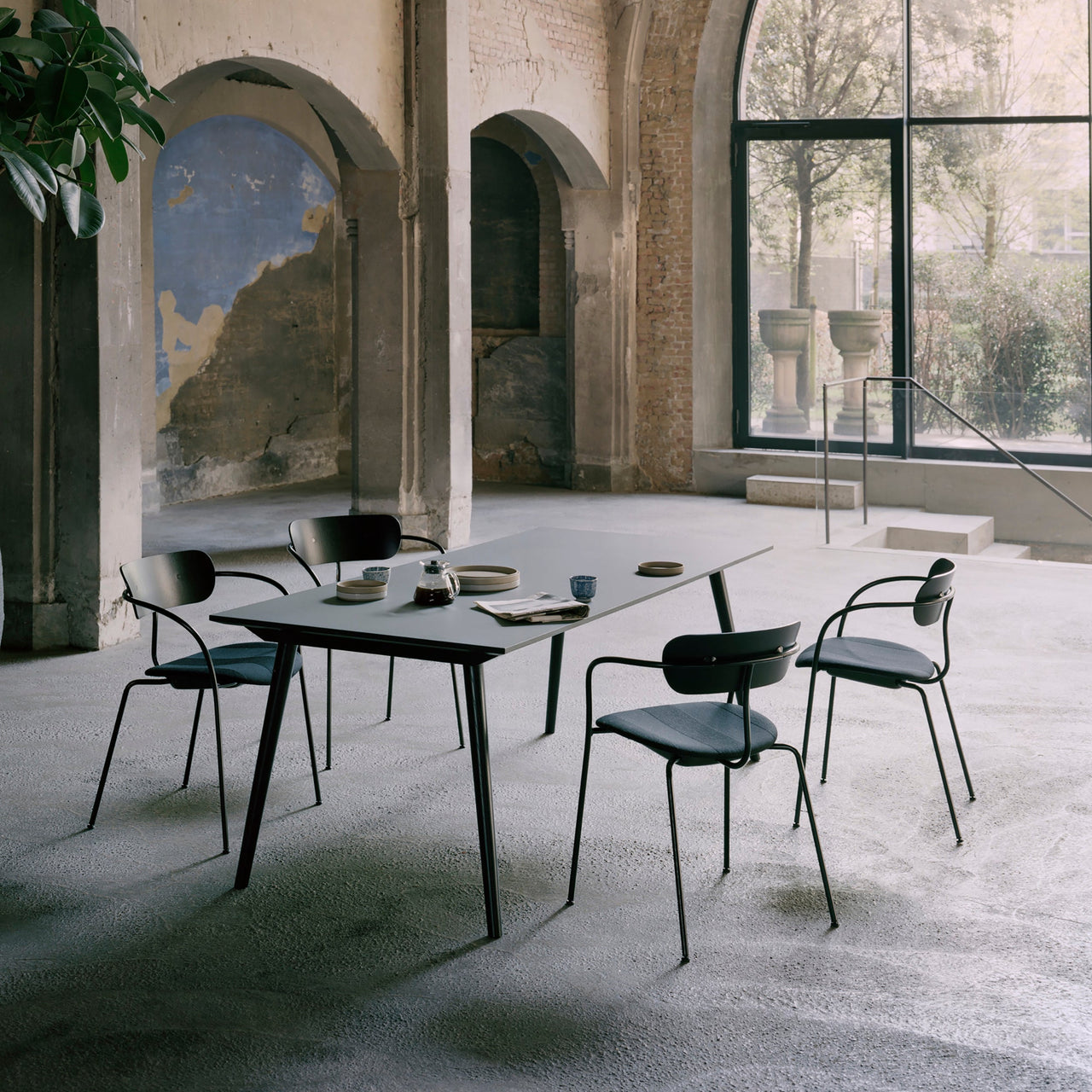With his solid oak In Between Table, Finnish-born designer Sami Kallio explores how an object interacts with its surrounding space. The slim silhouette and absence of ornamentation make it an ideal match for any chair—and especially suited to his companion In Between Chair, as the legs of the table echo the angle of the front legs of the chair. Such faultless simplicity is achieved through a combination of traditional hand craftsmanship, involving compression molding and woodturning, and innovative modern veneer techniques. Rectangular version available in two sizes. Copenhagen-based &Tradition's Martin Kornbek Hansen lauds Sami's "uncanny ability to design an object so simple, it exudes beauty.