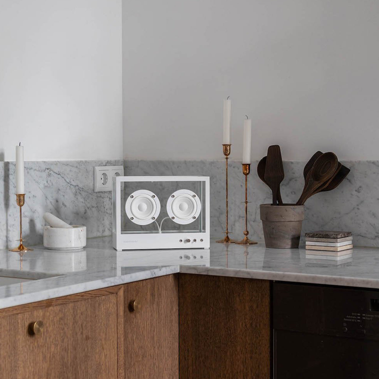 Built with tempered glass and aluminum, the Small Speaker delivers 30W of power through two custom 3-inch full-range drivers. Its sealed 3-liter enclosure, paired with an integrated Class-D amplifier and digital signal processor, ensures precise and balanced sound with a frequency range of 60 Hz to 20 kHz. Bluetooth 5.0 and True Wireless pairing support multi-speaker setups, while dual 3.5mm inputs offer wired connection options. Designed with a modular structure, it supports future upgrades and repairs, helping to extend its usability over time.