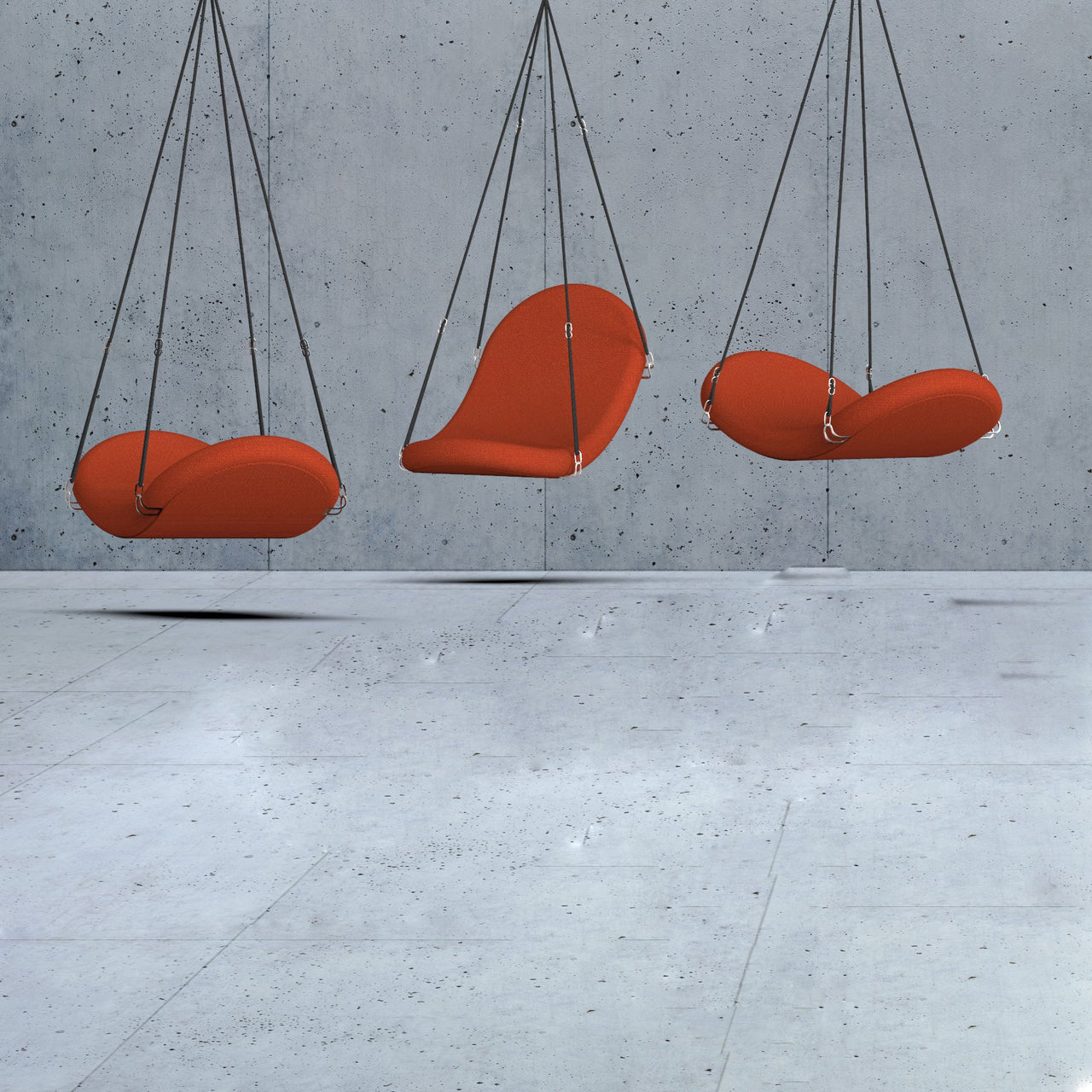 Verner Panton’s penchant for futuristic shapes meets free-form comfort in his suspension lounge chair. Flying High (circa 1964) hangs from the ceiling and its height can be adjusted to accommodate varied seating/reclining positions. The legendary designer’s half-shell seating is crafted from a molded plywood form and supporting steel frame sheathed in foam, with nylon suspension ropes and steel fittings.