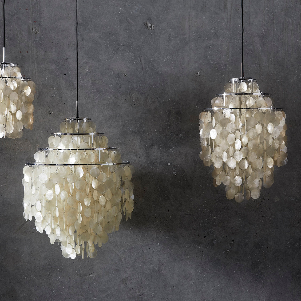Legendary designer Verner Panton first introduced Fun 0DM in 1964. The shimmering pendant is made of natural mother of pearl discs suspended from stainless steel rings. The fixture has a sense of movement, slightly swaying in an errant breeze. Though he also fabricated the style with aluminum discs, Panton was especially drawn to the glow of the light that shines through the shells.
