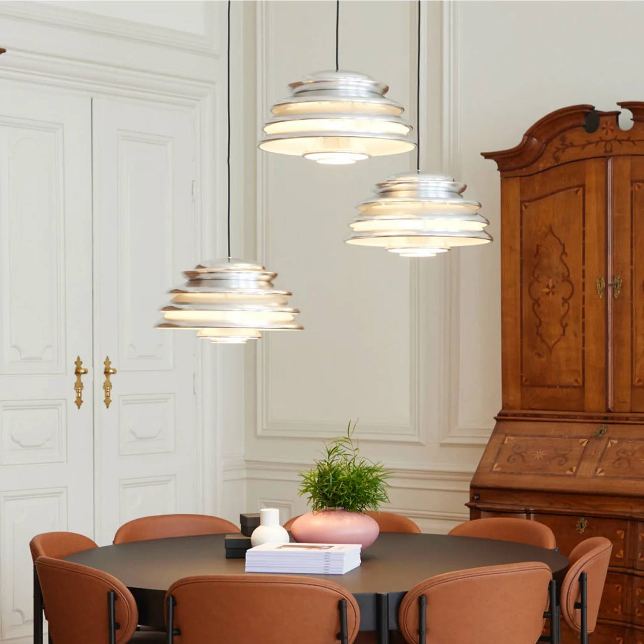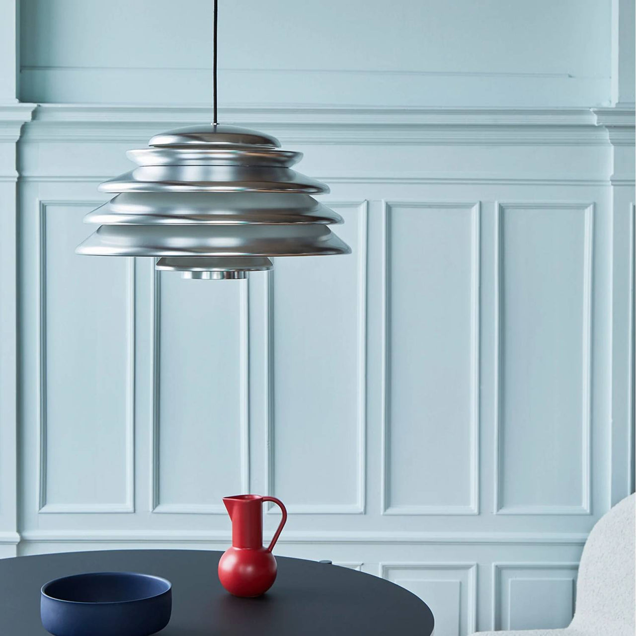 A sleek polished-aluminum finish plays up the sculptural quality of Verner Panton’s rediscovered pendant lamp. Based on drawings found in the late design icon’s archive, Hive Alu is newly produced by dedicated Verner manufacturer Verpan. The beehive-like form leaves a lateral glow via its layering of concentric shades while also emitting a more focused and glare-free downward light.