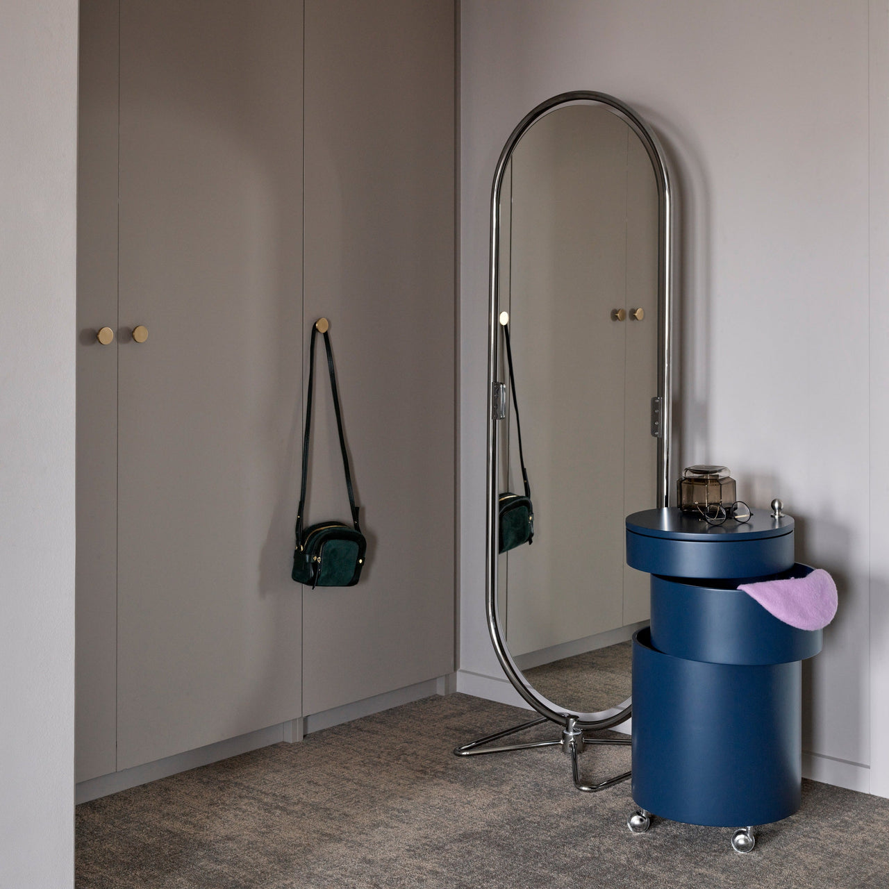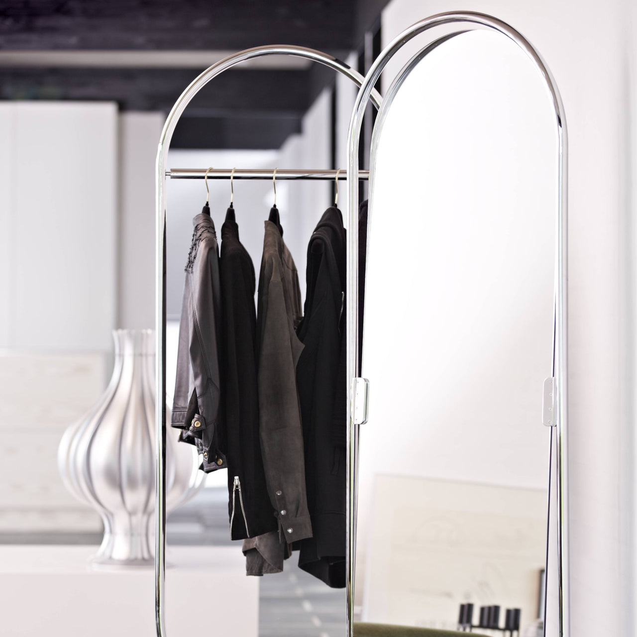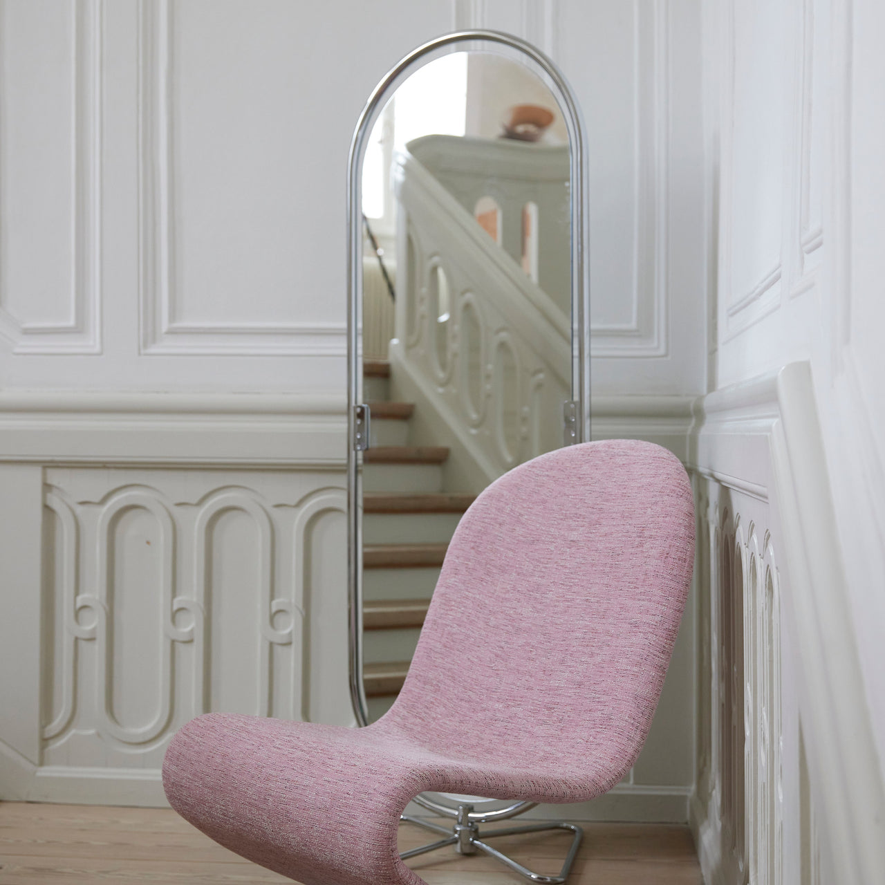 Design giant Verner Panton's System 1-2-3 Mirror takes its oval shape from his iconic seating series of the same name (which originally reflected the 3 versions of the chair). With its form traced by a chrome-plated frame, the double-sided floor mirror features a tilt function and pivots easily on its butterfly swivel base. An elegant accoutrement for the dressing area, bathroom or bedroom, the circa-1973 effort from the prolific Panton is also a rightful piece of design history.
