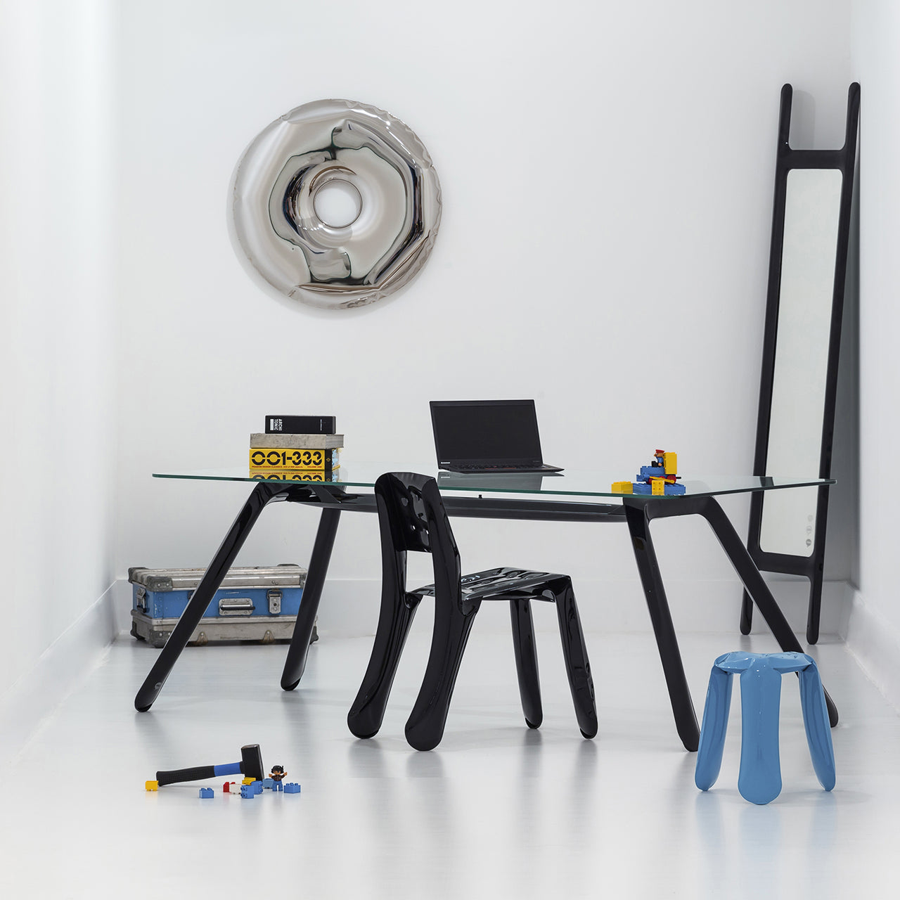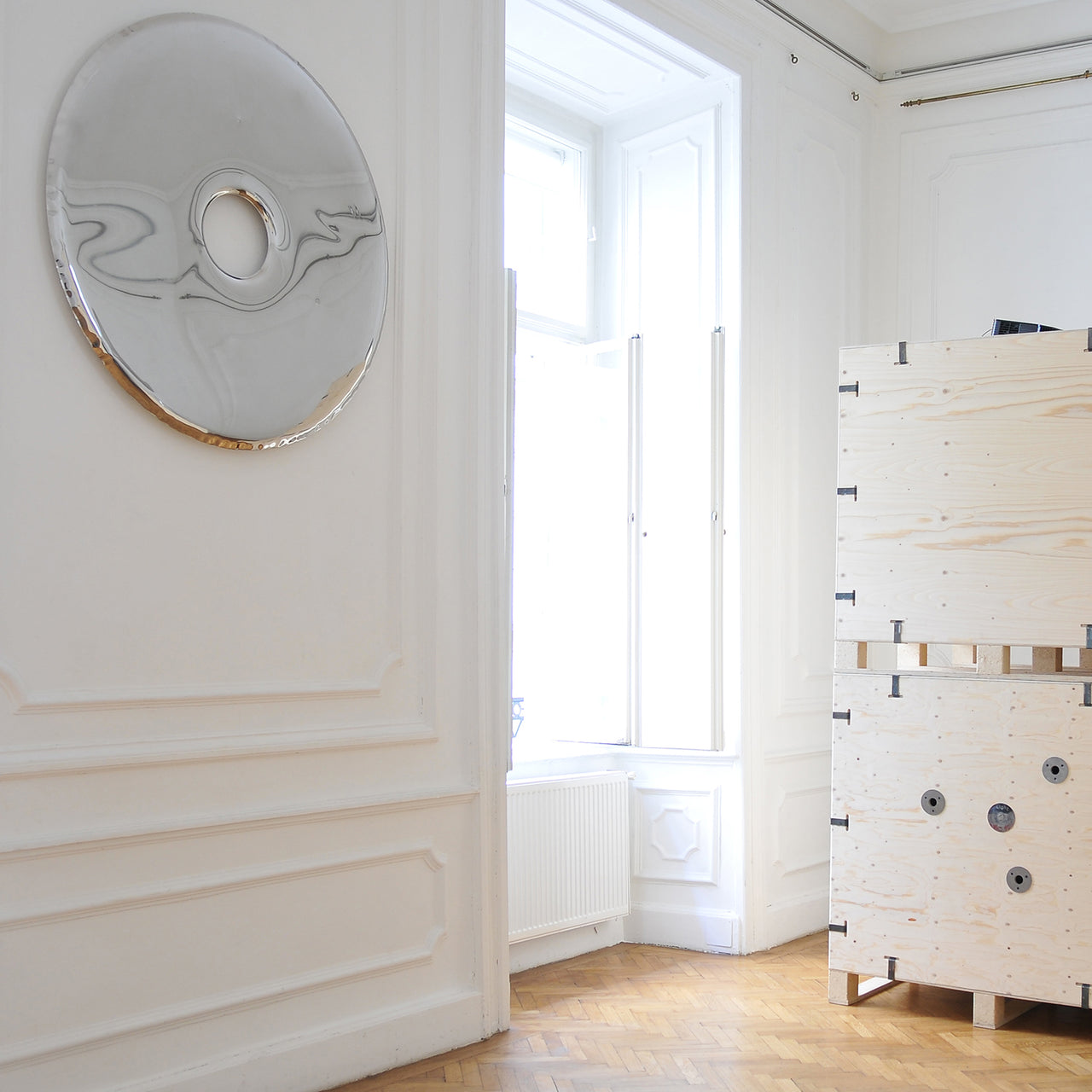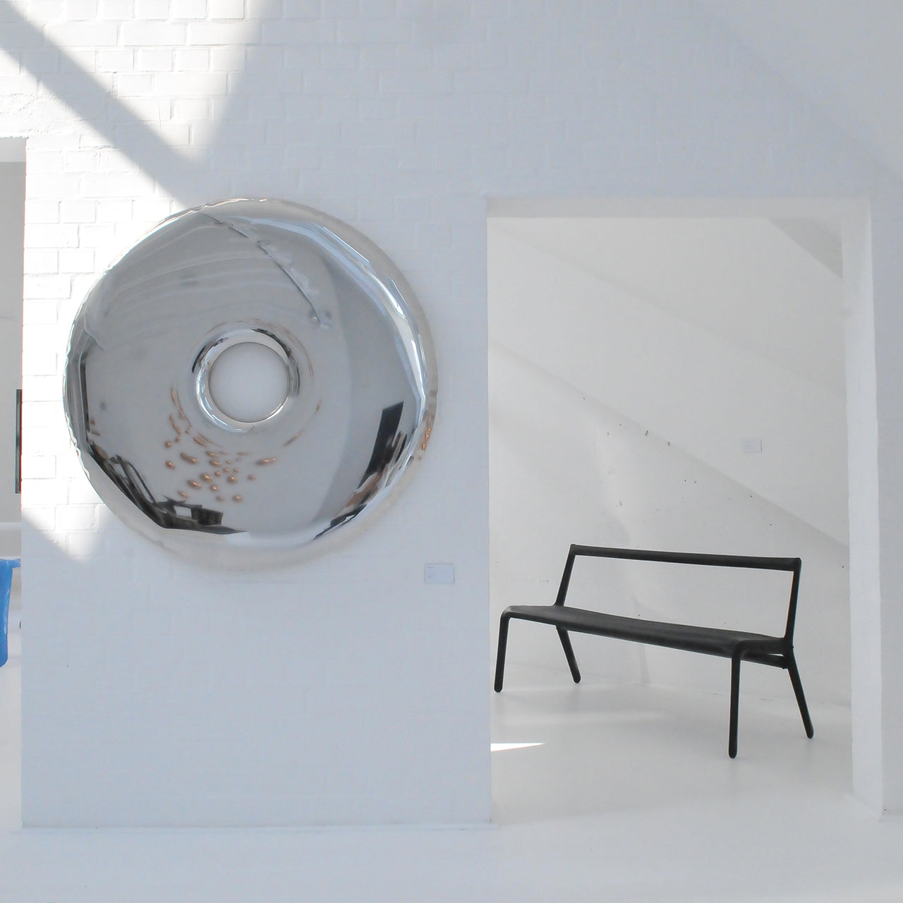 Rondo gets its remarkable color effect from the metal being glossed with a special lacquer. The minimalist mirror takes its form from Zieta’s unique FIDU process of shaping metal with compressed air. Each Rondo is thus one of a kind, its polished surface catching the light and giving surrounding reflected objects a dramatic perception.