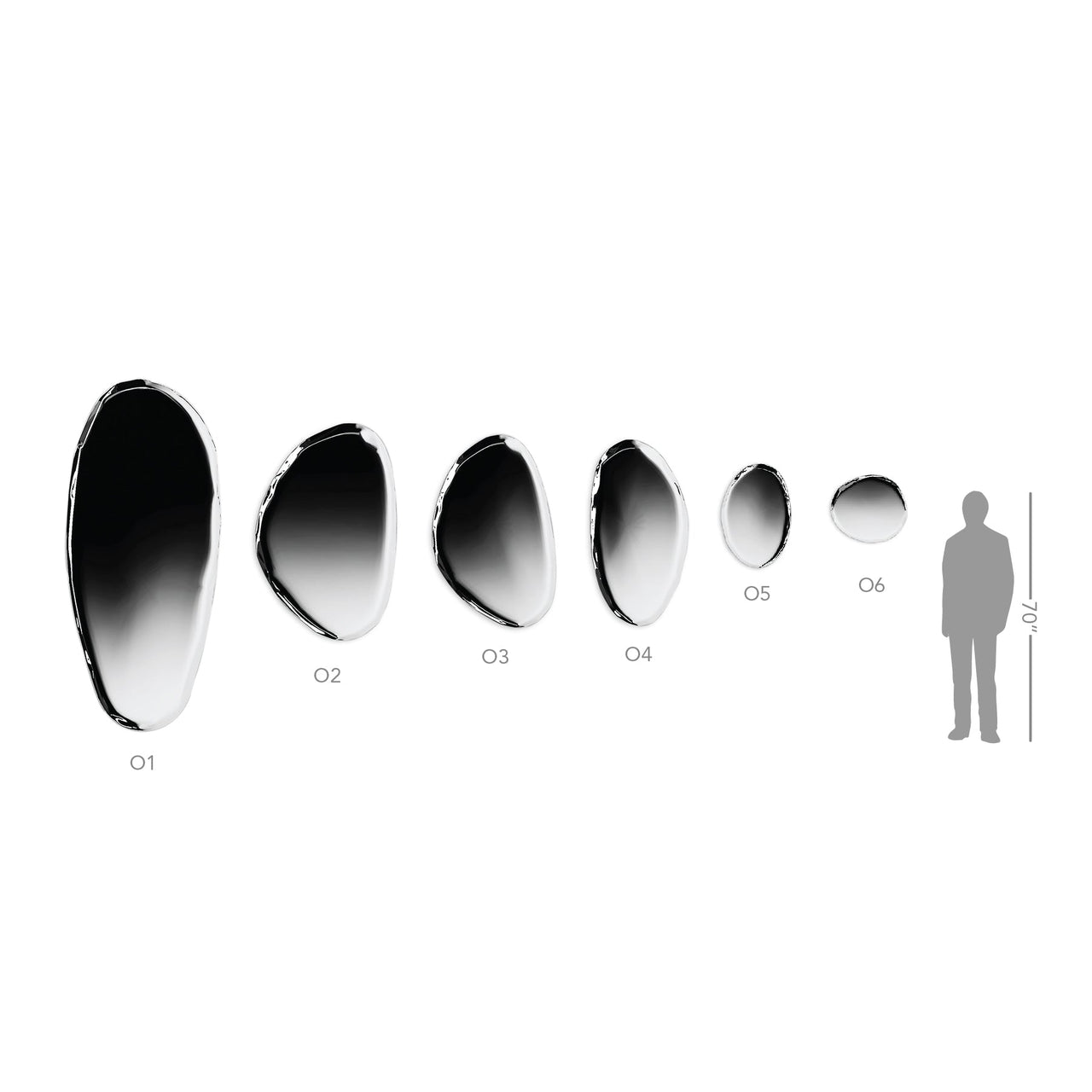 Polish innovator Oskar Zieta works from all angles with his Tafla Mirror Collection. Extending the innovative FIDU (short for Free Inner-pressure Deformation) process, he expands the concept of his original crumpled furniture to wall hangings that are nothing short of works of art. While they suggest silvery mylar balloons, each piece is made from thin welded sheets of steel and inflated with high-pressure air, making each one of a kind.
