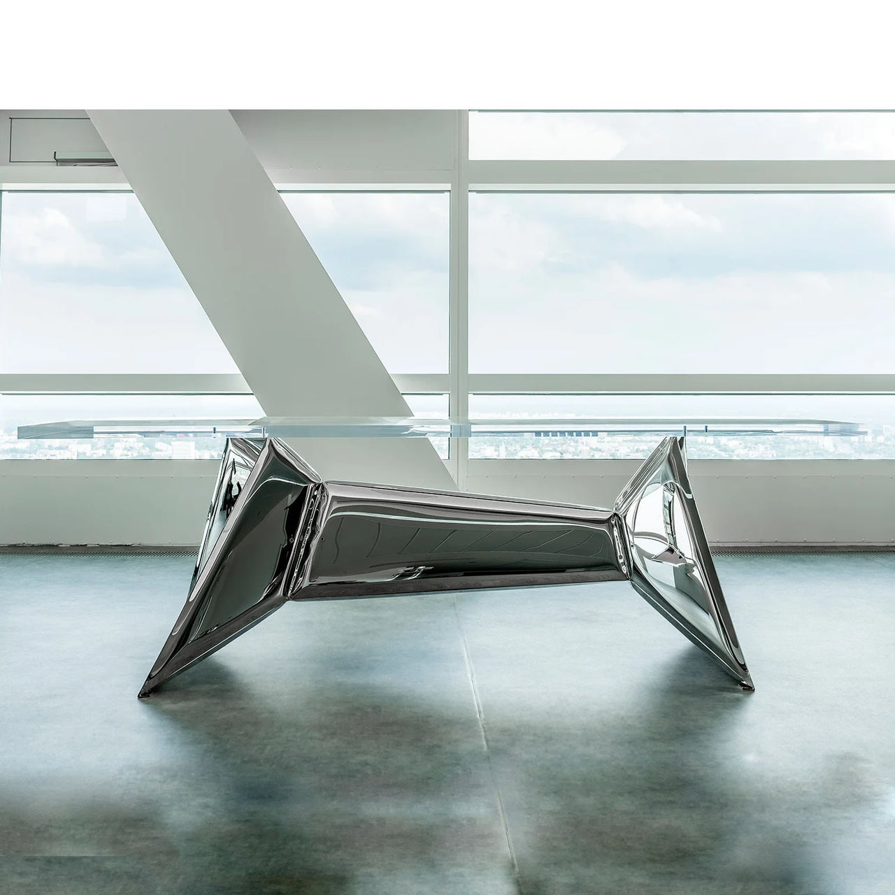 Oscar Zieta's diamond-inspired Crystals motif animates the mirrored stainless-steel base of a spectacular dining table. Polished surfaces curve with the light, creating a stunning game of reflections and shadows—achieved through the designer's ingenious FiDU process in which sheets of metal are welded together and then injected with pressurized air to form a 3-dimensional shape. It's paired with a tabletop in substantial clear acrylic so nothing interrupts the view of this dramatic statement piece.