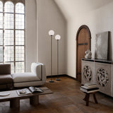 Astep’s Model 1081 Floor, a recently reintroduced 1959 lighting avatar, continues design legend Gino Sarfatti’s evocative interpretation of the luminous sphere. Available in a choice of heights, its single opal glass globe rests delicately on the black-finish steel stem and base, glowing with a warm and diffused light.