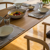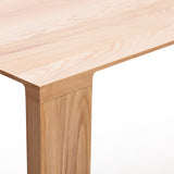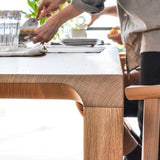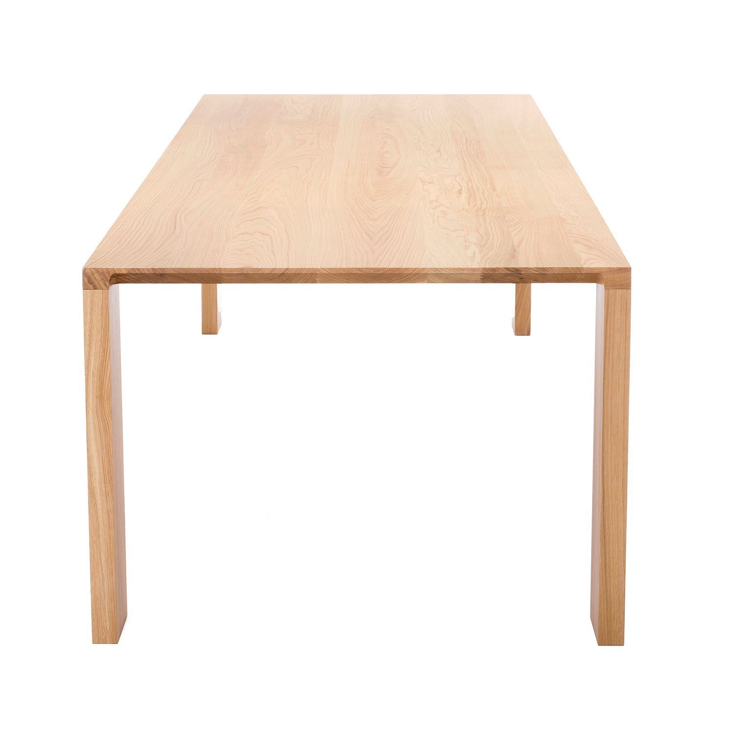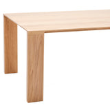 Radii grades on a refined curve with its signature beveled tabletop detail that follows radius cuts to blend with the legs. This gives the solid-wood dining table a visual lightness while extolling its superb craftsmanship in a choice of white oak or American walnut. A lengthwise tensioning bar inset in the underside of the top keeps it perfectly flat over time while lateral steel bars eliminate any wood shifting or cracking. Table finished with an advanced water-based polyurethane for a natural open-grain look with lasting durability.