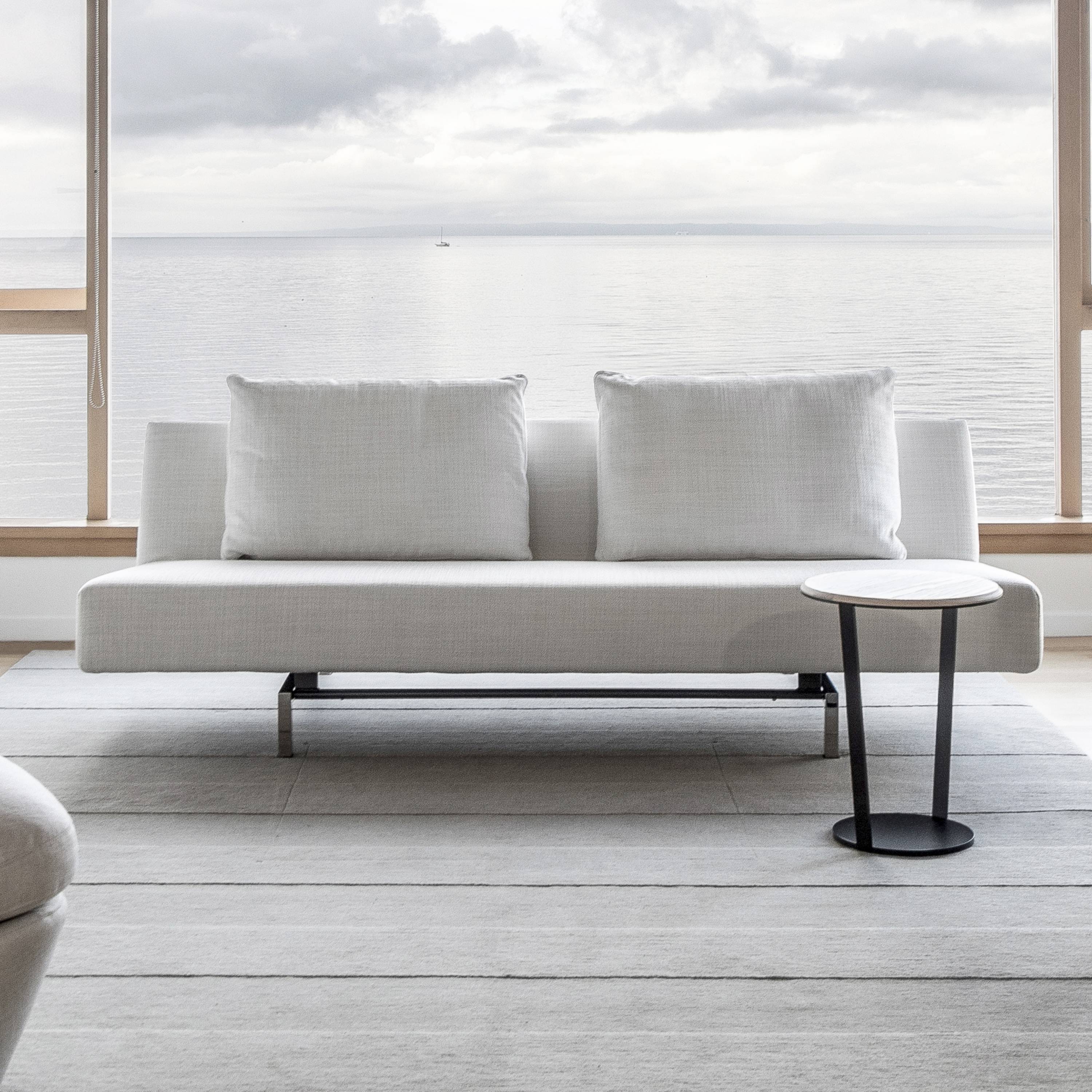 Sleeper completely rethinks the sofa-bed with a fully supported foam seat and back that effortlessly folds open in one smooth motion. Bensen has developed a unique pivoting system that uses gravity and the sofa’s own weight to lock itself into place. With its welded steel frame that provides strength while maintaining a rigid base, Sleeper is also relatively lightweight compared to clunky wood-framed models. Cushioning is high-resilience seating foam, layered in differing densities, and covered with a removable fabric cover or upholstered in leather.