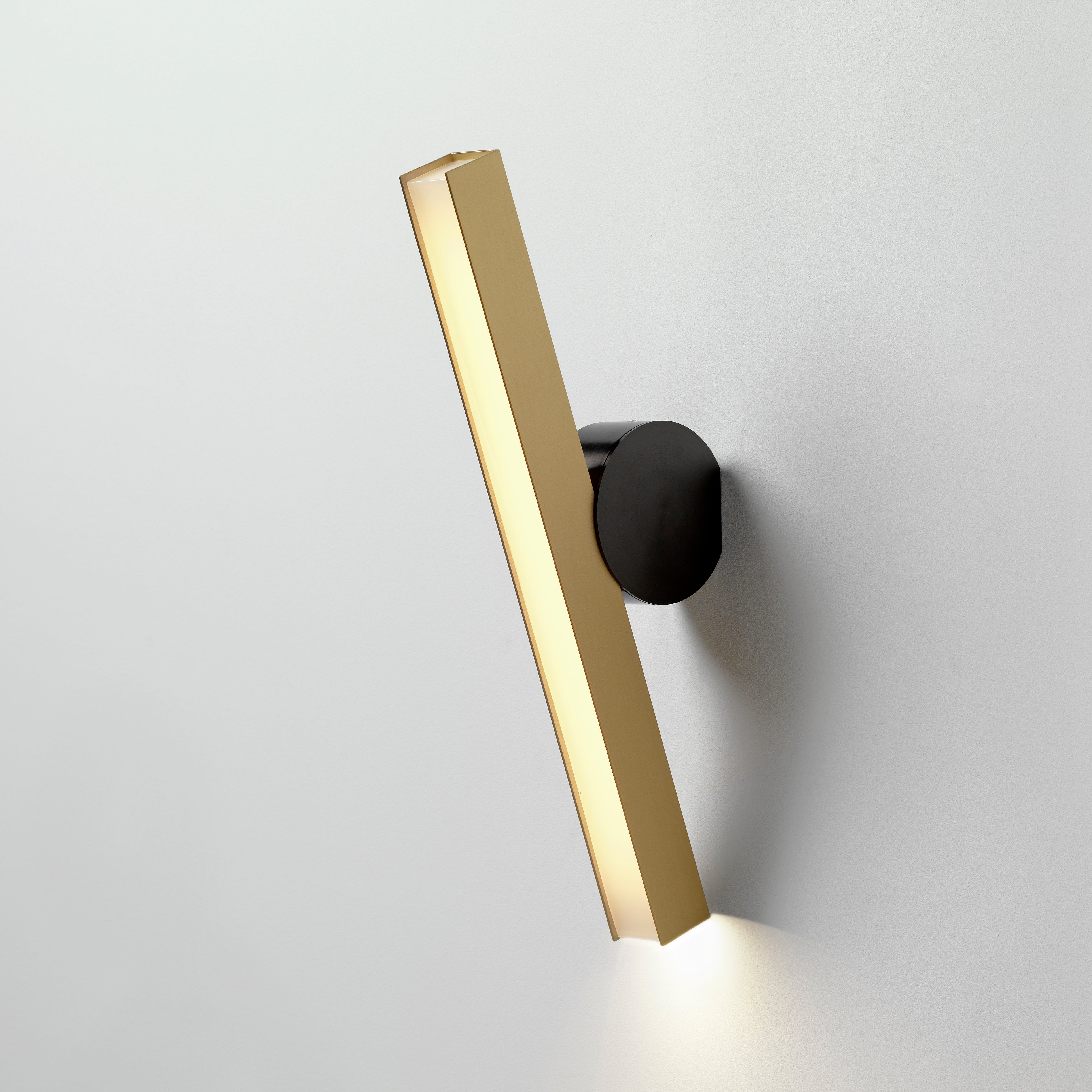CVL’s tilted IP Calé(e), like its 2 sibling versions, is designed expressly for use in the bathroom. “Caler" in French means to balance or to hold in place, which aptly describes the geometric equipoise of the wall fixture’s round and linear elements as designed by Paris studio Pool. With an integrated LED light source for warmly even illumination, it’s composed of solid brass in a choice of matte or polished metallic finishes.